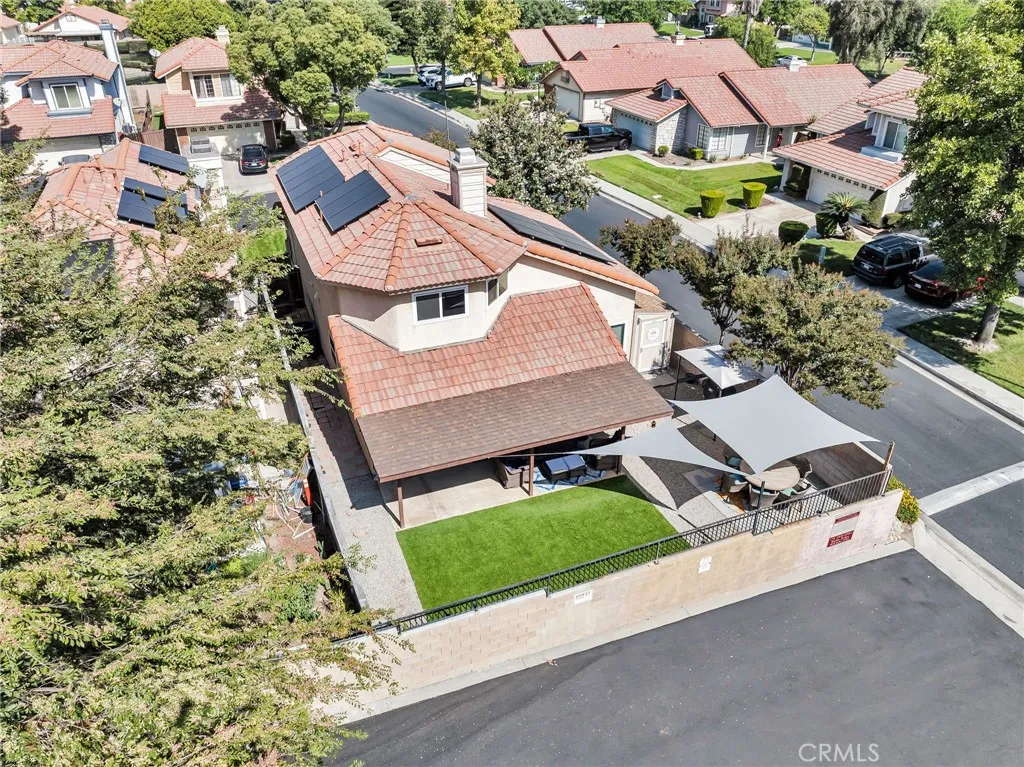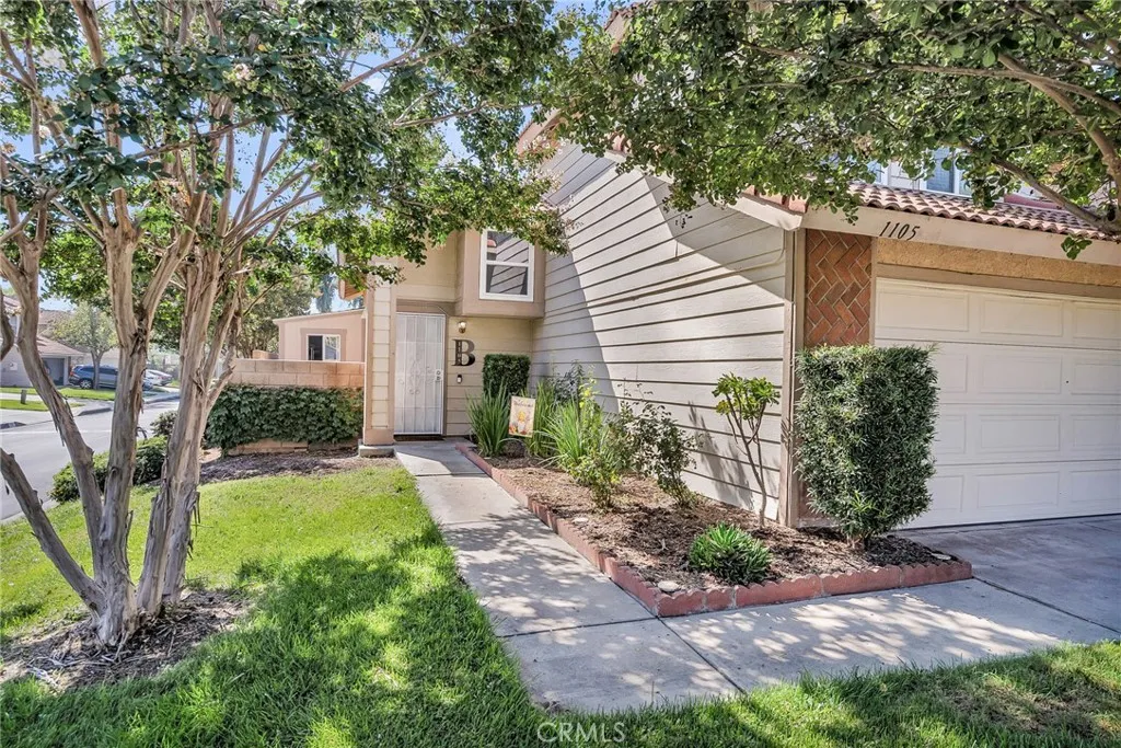 This upgraded home in Andover Square Community of Rialto is Move in Ready. The corner lot location with no adjacent rear neighbors provides additional privacy. Upon arrival the beautiful herringbone brick accents along with the lush landscaping will welcome you in. The living room has cathedral ceilings, a cozy fireplace and an abundance of natural lights that cascades throughout the room from the multiple windows. There is a formal dining alcove or currently used as the piano area adjacent to the living room. The kitchen has been remodeled with stainless steel appliances, upgraded warm cherry stain cabinets and stone counter tops. The dining area that is connected to the kitchen is spacious and looks out onto the rear patio. The laundry area is conveniently located near the kitchen and downstair bathroom. Upstairs there are 2 large additional bedrooms, a full bathroom and the primary suite. The primary suite is located towards the rear of the home adding to its privacy. The primary has 2 closets and its own private bathroom; this is the perfect sanctuary you have been searching for. The decorator paint colors and upgraded flooring add to the overall modern feel this home offers. Along with the decorator touches, remodeled kitchen and baths the upgrades also include a newer HVAC. The rear yard has a covered patio, artificial turf and has been thoughtfully designed for low maitenance and entertaining in mind. The shed is completely finished with drywall on the interior and has electrical outlets and lights, making it a perfect art studio or office space. This wonderful neigh
