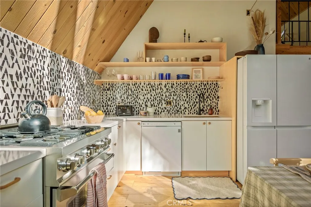 Tucked among the trees just moments from the lake and the charming village of Blue Jay, this beautifully remodeled 1970s A-frame captures everything people love about mountain livingretro character reimagined with a clean, modern spirit. Inside, sunlight filters through iconic triangular windows onto custom cabinetry, quartz countertops and hardwood floors that make the space feel both elevated and effortless. The home can be delivered completely turnkeyoffered with its curated furniture and full inventoryso you can getaway, right away. With central A/C, Anderson double-paned windows, a hard-to-find flat lot, seasonal stream and *plenty of privacy*, its ideal for outdoor lovers who dream of forest dinners and fireside stories under the stars. Below, a spacious unfinished build-up offers tons of storage plus exciting potential for future expansion-- and yes, it has lake rights. Currently a successful short-term rental with an active permit, this home makes the perfect weekend home, full-time retreat, or investment property when life calls you elsewhere.
