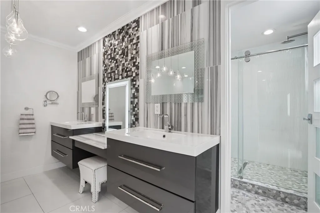 Imagine a single-level stunner with a designers touch. This 3-bedroom, 3-bath beauty will have you captivated from the curb. Stacked stone walls, meticulous dryscaping, and a wide front yard set the tone as you arrive on this picturesque, tree-lined street. A terraced pathway leads to the sizeable porch, ideal for showcasing seasonal decor or chatting with passersby. Inside, wide-plank floors stretch under vaulted ceilings, with recessed lighting and crisp white hues giving the home an effortlessly modern air. The flow is seamless between the sunlit living room illuminated by bright windows and a refined dining hall, where built-in display shelves, a tray ceiling, and a dry bar stand ready for intimate celebrations. Your kitchen is equal parts function and flair: track lighting spotlights every culinary move, and the luminous countertops shine beside stainless steel appliances and an oversized sink. A waterfall-edge multi-seater peninsula gleams beneath pendant lights, inviting conversation while delicacies take shape under diligent hands. In the generous step-down family area, skylights crown soaring ceilings, while an accent wall creates a counterpoint to sliding glass doors that frame the connection to a private oasis. Your entertainers backyard is a secluded haven, whether gathered under the gazebo beside the fire pit or enjoying quiet evenings sipping cocktails on the custom hardscaping bordered by living pathways. When its time to unwind, tranquility can be found in any of the well-proportioned bedrooms, each with a contemporarily designed bath conveniently at hand. D