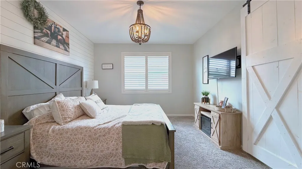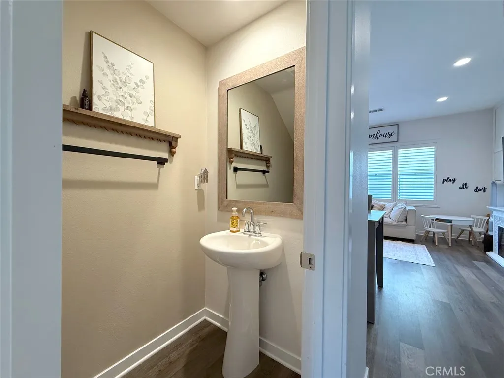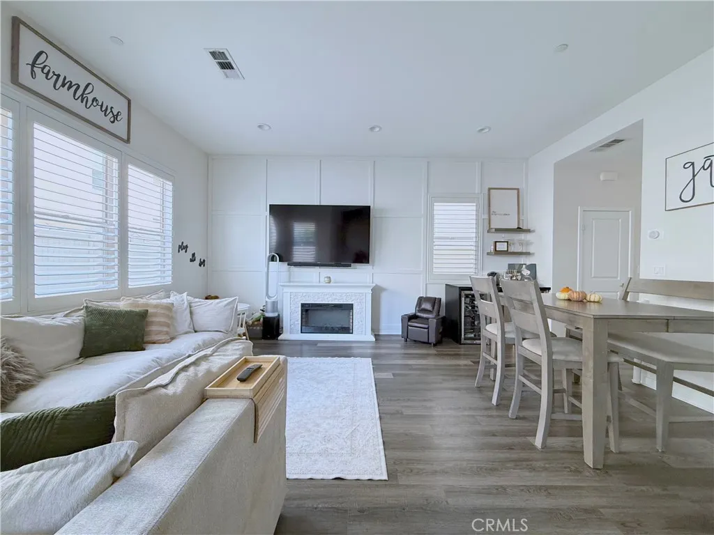 Welcome to your new home sweet home! Discover this bright and modern two-story home in the heart of the lively Bedford Community. The open-concept main floor is perfect for entertaining, with a gorgeous spacious kitchen that flows out to a sunny private patio featuring a paved section, turf, and an outdoor tv. The kitchen boasts tasteful features with a hexagon marble backsplash complimented with warm soft grey cabinets and uppers for additional storage and a brand new garbage disposal. The vinyl wood floors continue throughout the lower level, up the naturally lit stairwell accented with a custom mosaic pattern, and into the upstairs hallway and laundry room. Across from the hallway storage area, a full bathroom sits between two bedrooms one of which features a small private balcony. The primary bedroom is inviting and spacious, complete with a cozy side nook, and a farmhouse style sliding barn door that leads to the on-suite bathroom. A double sided mirror door opens into the walk-in closet with custom built in shelving. The walk-in shower and private commode area complete the space. The two-car garage is wired and ready for EV charging installation. Residents enjoy access to Bedfords resort-style amenities two clubhouses, pools, fitness centers, and charming community BBQ areas. Fall in love with the variety of options available for dining, shopping, hiking, biking, and having hot spots nearby like the Shops at Dos Lagos, Eagle Glen Golf Club, and Amazon Fresh. Come see why Bedford feels like home!