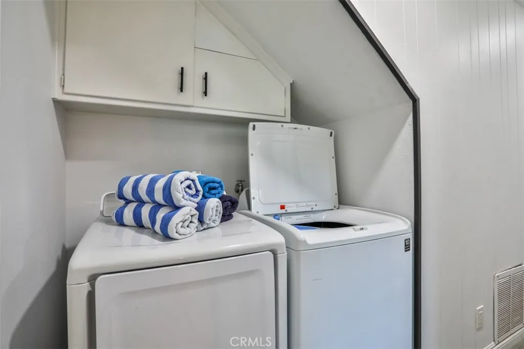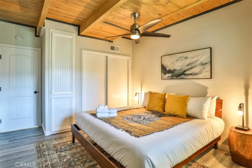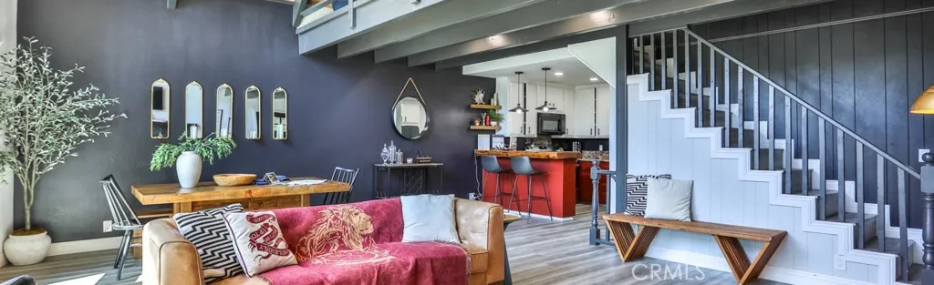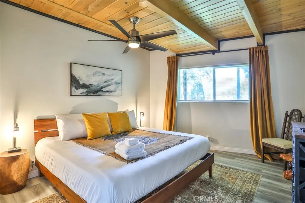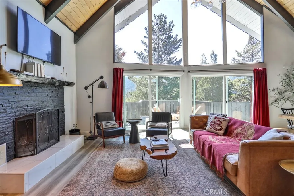 Escape to the serene, alpine beauty of Crestline with this charming A-frame cabin that blends classic architecture and modern comforts. Nestled less than a mile from the picturesque Lake Gregory, adventure awaits with hiking trails like Crestline Canyon, Heart Rock, and Strawberry Peak nearby. Step inside to the soul-inspiring living room with soaring, two-story vaulted ceilings adorned with natural wood and open beams, creating a warm and inviting ambiance. Awash in natural light from two-story windows framing stunning mountain views, the living room offers a perfect retreat to unwind and make memories. Enjoy cooking up a great meal in the upgraded kitchen, featuring granite counters, custom tile backsplash, and pendant lights over the breakfast bar. Central heating, ceiling fans in each bedroom, and dual-pane windows ensure year-round comfort, while the cozy fireplace beckons for relaxing evenings. Fully remodeled with laminate flooring and custom lighting throughout, this retreat is move-in ready. The upstairs loft offers a second, cozier living space with a beautiful view and a cathedral-ceilinged bedroom. Downstairs, youll find three additional bedrooms, a fully remodeled bathroom, and the washer and dryer. One of the bedrooms does have a closet and is currently used as a game/storage room. Relish in evergreen, mountain vistas from the wraparound deck, perfect for stargazing or savoring your morning coffee. With Lake Gregory less than a mile away, enjoy fishing, boating, or a leisurely stroll along the scenic trail. Crestline's shops and restaurants are less than two m