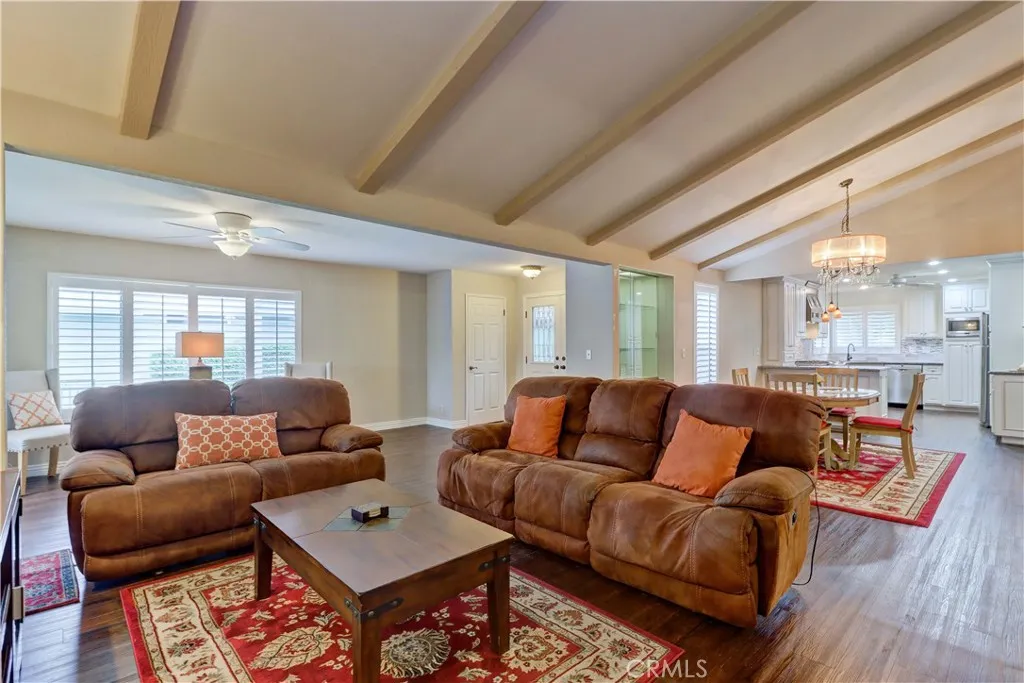 Senior Living 55+. Welcome home! As you drive through the gates of Lake Park you are met with the serene scene of the sparkling lake and fountain surrounded by mature, statuesque trees. Continue past the pool and club house to this beautiful 2 bedroom and 2 bath home. This gem features open concept floor plan and features vaulted ceilings, large windows allow for plenty of light, and laminate flooring throughout the home. The living room and dining room area has open feel with high, wood beam ceilings and lots of windows providing great cross ventilation to capture the afternoon breeze. Double glass doors open to the inviting outdoor areas with covered patio and green garden. Beyond youll see gorgeous views of park like greenbelts and trees. Kitchen has been elegantly remodeled with timeless, neutral colors and feature granite counters and breakfast bar, stylish cabinets, glass tile backsplash, stainless steel appliances including range, oven, built-in microwave and dishwasher. Primary suite has a large walk-in closet and looks out over your patio and garden. Luxuriate in your primary bathroom with spa-like, tile and walk-in glass shower enclosure. In addition to the secondary bedroom there is a den area adjacent to the living room that features a space-saving Murphy bed for additional guest accommodation, both just steps away from the guest bath. Inside laundry room with gas dryer and washer for convenience and ease. The 2 car attached garage has built in storage and remote access. You can carry your groceries straight into the kitchen from your private parking space. Plen