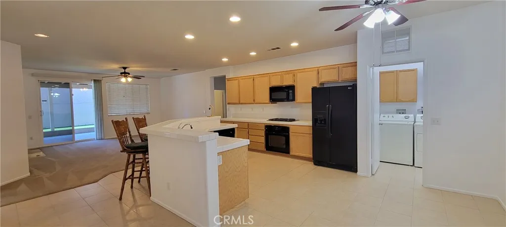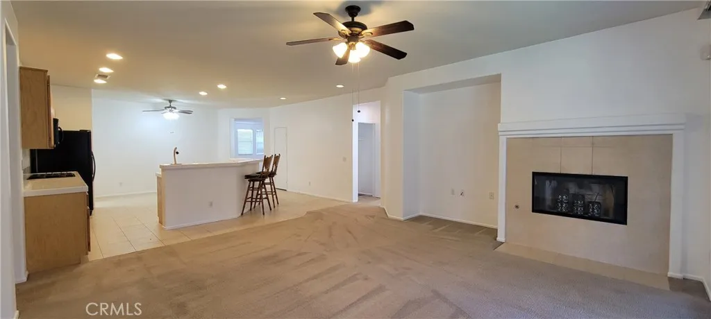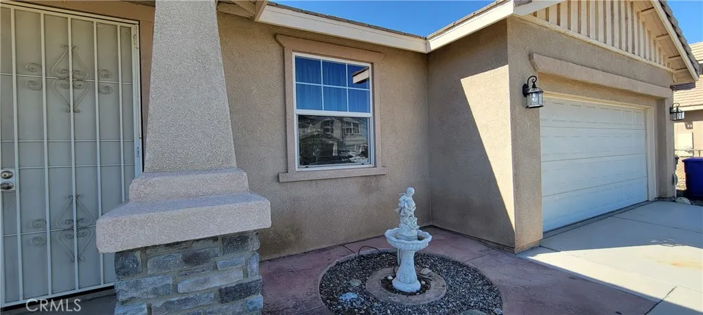 Charming corner house in Victorville. This four bedrooms, two bathrooms home features a plus room next to the living room, perfect for a home office or playroom. The interior is carpeted in the living and dining areas, bedrooms and family room. The open-concept kitchen features tile counter and backsplash and tile flooring. A built in island with sink and bar stool counter is ideal for casual dining and entertaining. There is a fireplace in the family room that sets a warm ambiance. the sliding door provides direct access to the spacious backyard with a large covered patio. The main bedroom boasts an on-suite bathroom with a sizable walk in closet, a separated tub and shower area, an enclosed toilet room for privacy, a dual sink vanity with drawers to maximize storage. The front yard features a hog wire fence with metal post and frame for security, covered pebbles, and a built in water fountain. Additional space for RV parking on the south side of the house. Equipped with leased solar panels to reduce your electricity bills and support sustainable living.