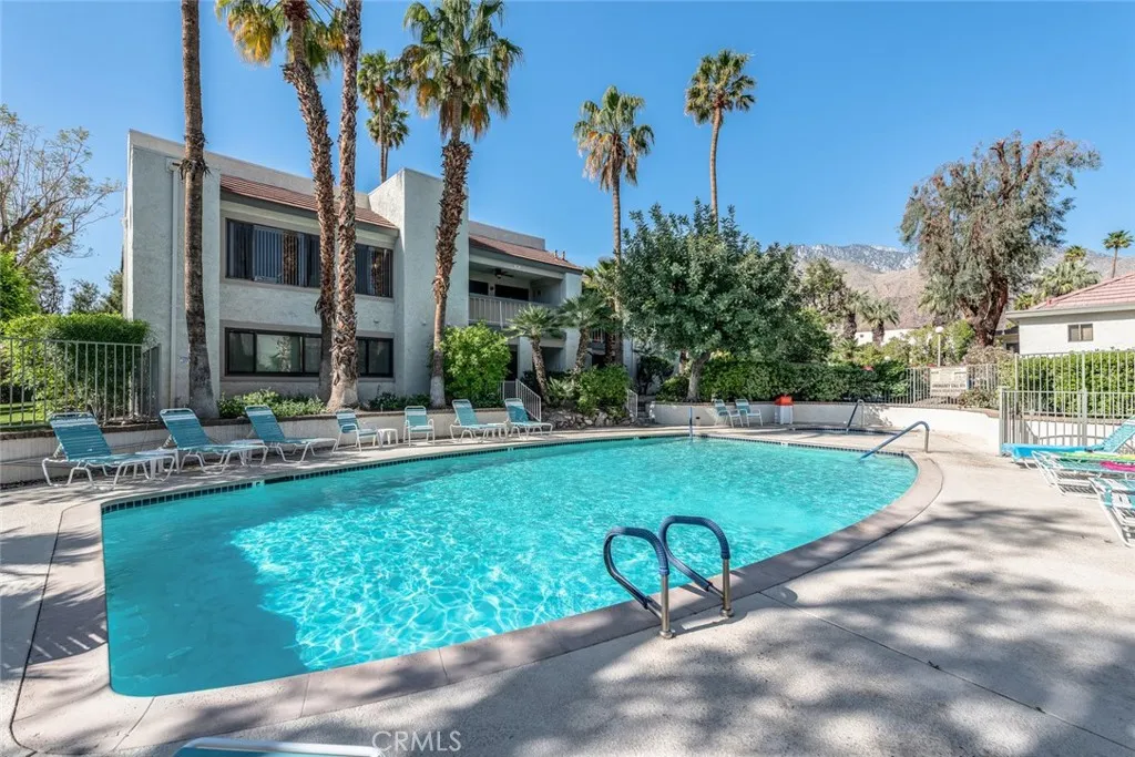 Largest 1BR floor plan at Riviera Gardensplus the rare kitchen window. | Fully remodeled with a clean, contemporary look: quartz counters, updated cabinetry with under-cabinet lighting, newer GE appliance suite, and an island with additional ambient and task lighting. | Spacious bedroom suite features an ensuite bath and custom built-in closet. | Storage is a standout: there's an extra closet in the bathroom, a roomy entry-hall closet, and an additional closet on the patiotons of storage throughout! | Inside laundry (full-size washer/dryer) and a brand-new water heater. | Further Upgrades include luxury laminate flooring, updated ceiling fans (Living, Bedroom and Patio!), flush recessed lighting on Wi-Fi dimmers, and custom motorized blackout shades (also Wi-Fi). | New double-pane windows in the kitchen and bedroom boost comfort and efficiency. | Private tiled patio is wrapped in lush landscaping with views to a large greenbelt area, a mature orange tree, and vibrant gardensclassic Riviera Gardens, park-like and quiet. Just steps to the southern community pool & spa with majestic mountain views. | Covered assigned carport plus generous guest parking very close to the unit. | Located on FEE LAND (you own the land; no lease). | Gated community with well-kept grounds and fruit trees everywhere. | HOA dues include water and trash. | Move-in ready and SOLD FULLY FURNISHED. | Close to downtown Palm Springs, dining, and shoppingan easy lock-and-leave and Worry Free condo with a fresh, modern vibe.............................................. NOTE : OPEN HOUSE - SUNDAY 10/26 2.30pm