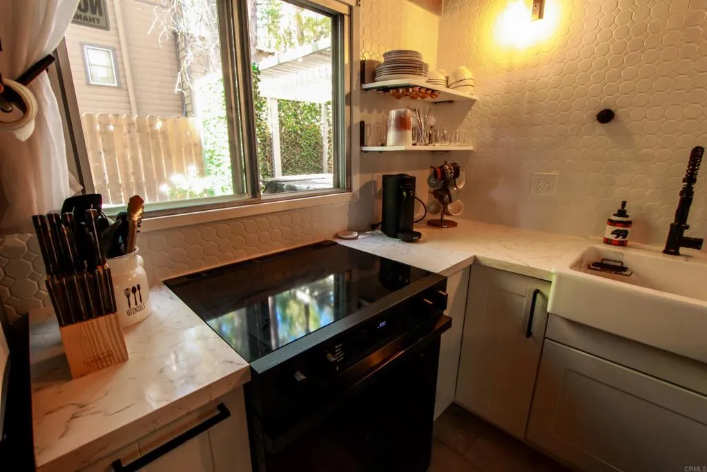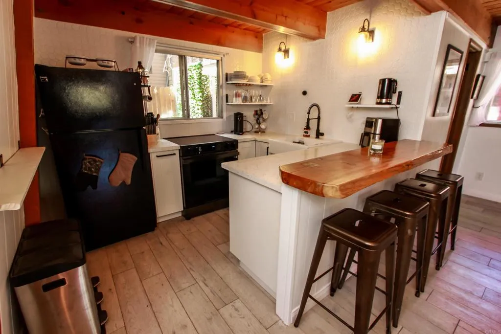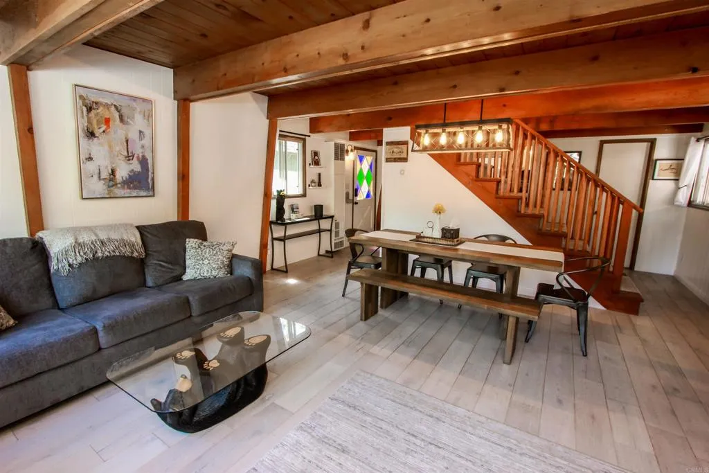 Youll love this classic Gambrel home in the highly desirable 92314 zip code in Moonridge, near Fox Farm! Located on a quiet street with a large empty lot across the street. Conveniently near Bear Mountain, the golf course, Zoo, and the newly improved Moonridge corridor. It has stunning pine wood vaulted ceilings with appealing stained exposed beams throughout the home. Kitchen has a beautiful farmhouse sink and faucet, modern quartz countertops, and a rustic live-edge wooden breakfast bar. It is equipped with new appliances, including an added dishwasher. The tile backslash and open shelves provide a clean, modern look. The 1.5 car garage is currently used as a game room (7 pool table with ping pong top, darts) and laundry room; potential to change to an ADU. The home features wood laminate flooring, new carpet upstairs, a brick gas fireplace, and six new electric heaters (bedrooms, garage, bathroom, in addition to the forced air heater downstairs.) A new tankless water heater in the garage has made available its closet by the front door great for a cleaners or coat closet! The home has all new furniture included, providing for a turnkey short-term rental or family vacation home! Its large deck starts as you walk up to the front door, and wraps around to the backyard for your own mountain Oasis! Enjoy the large pine and oak trees surrounding the property, as you relax in the hot tub and stargaze. Complete with outdoor shed for tools, snow shovel, etc. Bistro lights surround deck walkway as well as pergola over hot tub including outdoor table and patio chair set. Home is eq