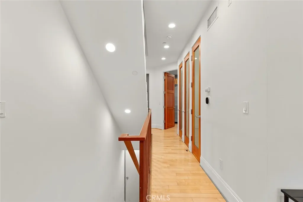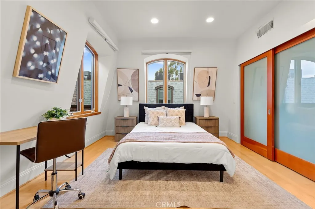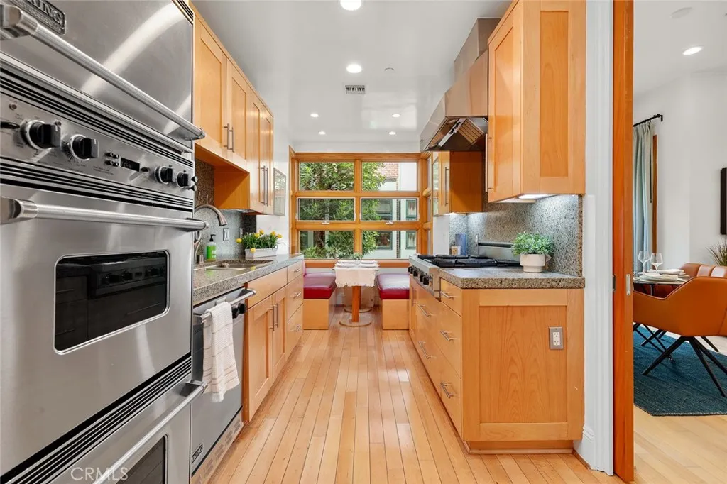 Bright and elegant front-corner townhome with a private entrance in the heart of Westwood. This 3-bedroom, 5-bath residence offers luxurious living with a 3-car private garage featuring a Tesla charger and your own elevator servicing all levels. The main floor showcases a spacious open-concept living area filled with natural light, featuring a cozy fireplace, a built-in bar with wine fridge, and access to a gated front patioperfect for entertaining. The gourmet kitchen boasts wood cabinetry, granite countertops and backsplash, Viking stainless-steel appliances, an LG microwave, and a charming built-in breakfast nook. A powder room completes this level. The entire second floor is a private primary retreat, complete with two oversized walk-in closets, a fireplace, a balcony, and dual bathrooms connected by a glass-enclosed shower and jetted tub. On the third floor, youll find two spacious bedroom suites with 9-foot ceilings, each with its own bathroom. Additional features include 10-foot ceilings in the living and dining areas, natural maple hardwood floors, skylights, and recessed LED lighting throughout. Enjoy year-round comfort with individually zoned Ecobee thermostats on each floor and a separate laundry room with a sink and cabinetry. Built with sound-dampening air space between walls for added privacy. Located in a prestigious gated community of just 12 homes, this residence offers both privacy and convenience. Ideally situated near UCLA, Century City, and Beverly Hillswith Rancho Park Golf Course and Cheviot Hills Recreation Center just blocks awayand boasting a Walk