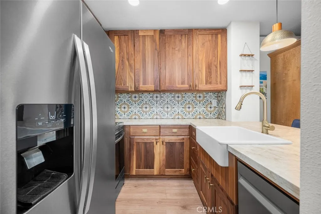 ***PRICE IMPROVEMENT*** Welcome to El Dorado Lakes, a truly special community on the border of Long Beach and Los Alamitos where modern comfort meets timeless charm. Set amidst meandering waterways, lush landscaping, and sparkling pools, this serene, resort-style enclave offers an idyllic escape from the everyday. This stunningly remodeled lower-level studio end unit perfectly embodies warmth and sophistication, featuring an open and spacious layout with a gorgeous kitchen showcasing sleek quartzite countertops, stainless steel appliances, and modern shaker cabinetry that flows seamlessly into the dining and living areas. Accent lighting adds a soft, inviting ambiance throughout. The fully updated bathroom features a frameless glass shower enclosure and designer finishes that elevate the space with a spa-like touch. A large walk-in closet provides ample storage, while the private deck offers tranquil lake viewsa perfect retreat for morning coffee or peaceful sunset reflection. Step outside to your own garden patio overlooking lily pad ponds and enjoy the soothing sounds of nature in this truly enchanting setting. Additional highlights include covered parking with storage, generous guest parking, and the peace of mind that comes with a gated, pet-friendly community. Spanning over 11 acres of lush, park-like grounds, El Dorado Lakes is a hidden gem featuring streams, lakes, and vibrant wildlife. Community amenities include a pool, spa, sauna, tennis courts, and a recreation lounge with billiards. Just steps from El Dorado Park, residents can enjoy nature trails, a dog park, g