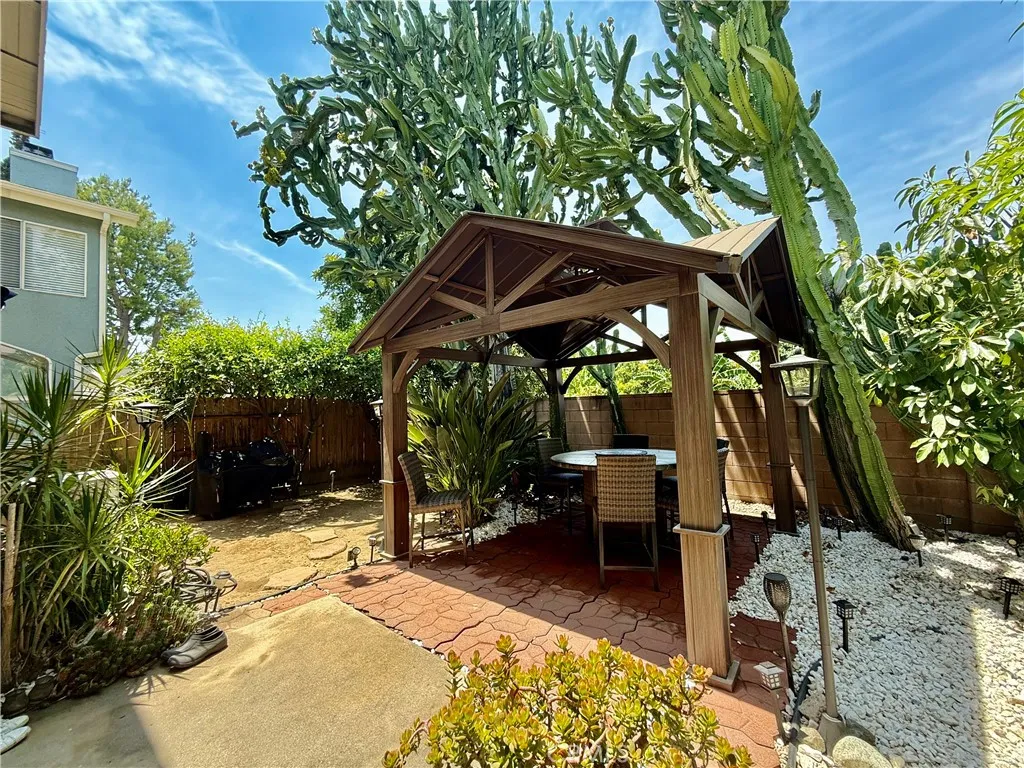 Welcome Home! PRICED TO SELL! This pride-of-ownership, free-standing two-story condo offers 1,896 sq. ft. of living space with 4 bedrooms and 3 full bathrooms, featuring numerous upgrades throughout. The flexible 4th bedroom (currently used as a formal dining room) is conveniently located on the main level with a full bathroom nearbyperfect for a multi-generational household or guest space. The living room boasts vaulted ceilings and arched windows framing a cozy fireplace. A custom kitchen provides ample storage, granite counters, high-end stainless steel appliances, and a charming garden window overlooking the private yard. The main level also includes side-by-side laundry and direct access to the backyard. A sliding glass door leads to the private enclosed yard, where youll find a covered gazebo with a fire pit table for six, mature avocado, fruit, and citrus trees, and striking flowering cactus for year-round beauty. Upstairs, the spacious primary suite features soaring ceilings, abundant natural light, a sitting area with fireplace, and a luxurious en-suite bathroom with jetted tub, separate shower, double sinks, and a large walk-in closet. Two additional bedroomsone with vaulted ceilings and the other with a charming built-in window seat3rd full bath completes the upper level. Additional highlights include: Newer carpet, flooring, and paint, Full security alarm system plus exterior & interior Ring cameras Epoxy-finished garage with insulated door, automatic opener, and storage (freezer included). Gated community with controlled entry. Lovingly cared for and on the mar