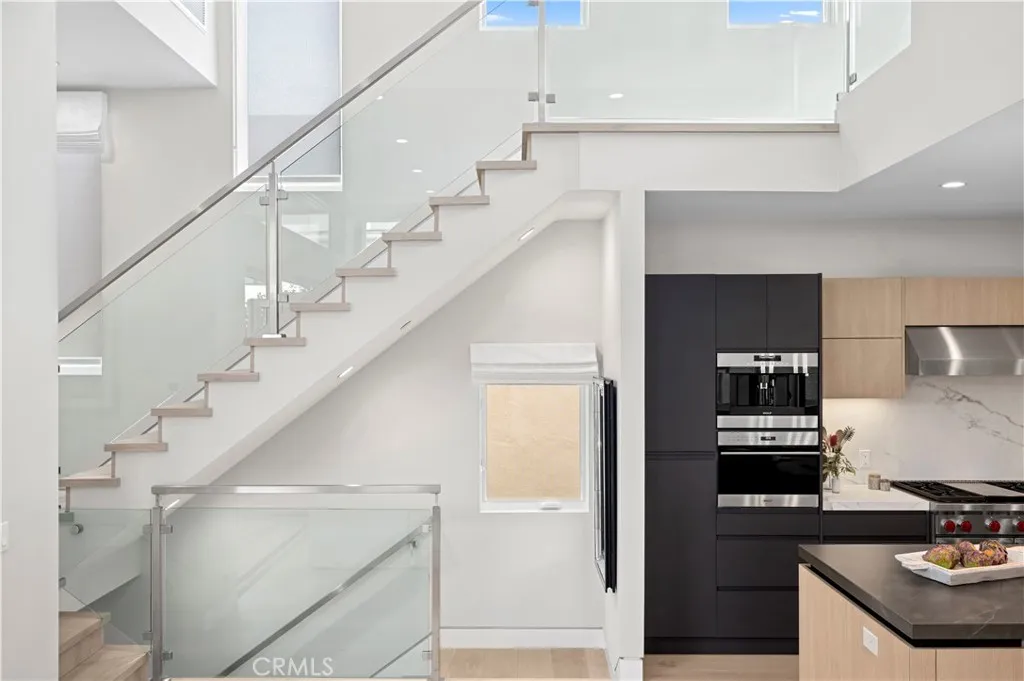 Located on the ocean side of PCH, this residence was built with exceptional craftsmanship and refined design, offering two bedrooms, a spacious office, and two and a half bathrooms. The main level features an open-concept great room with soaring ceilings, an impressive glass staircase, and a sleek Porcelanosa stone fireplace. Tall bi-fold doors open to a covered loggia with a built-in Bromic heater, creating seamless indoor-outdoor living. The gourmet kitchen is equipped with custom handle-free cabinetry, Neolith stone island and countertops, and Wolf and Sub-Zero appliances, including a 6-burner range with griddle and dual ovens. A custom bar accents the dining area. The primary suite, located on the main level, includes a large walk-in closet and a spa-inspired bath with double vanities, a soaking tub, walk-in shower, a private commode, and designer finishes. Additional highlights include beautiful wood flooring, flush baseboards, programmable LED lighting, and multiple outdoor living spaces. The upper level offers a secondary ensuite bedroom, while the rooftop deck provides panoramic sunrise-to-sunset views, refreshing ocean breezes, and sweeping views of the city, Pelican Hill, and the ocean. Situated on desirable Acacia Avenue, one of the few streets in Corona del Mar with underground utilities, this home epitomizes modern luxury and coastal sophistication.