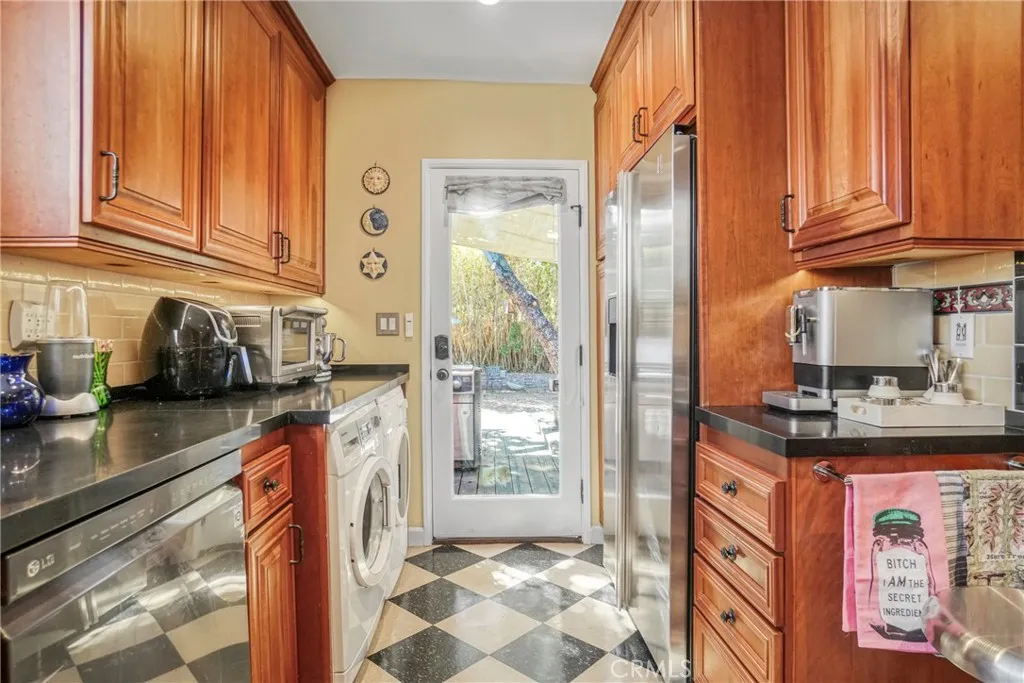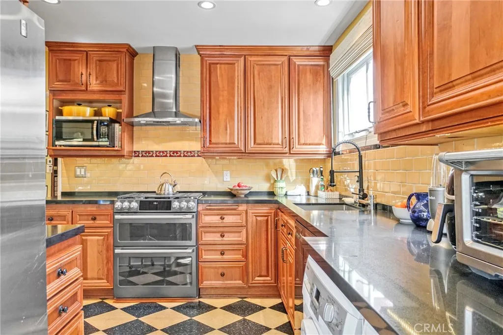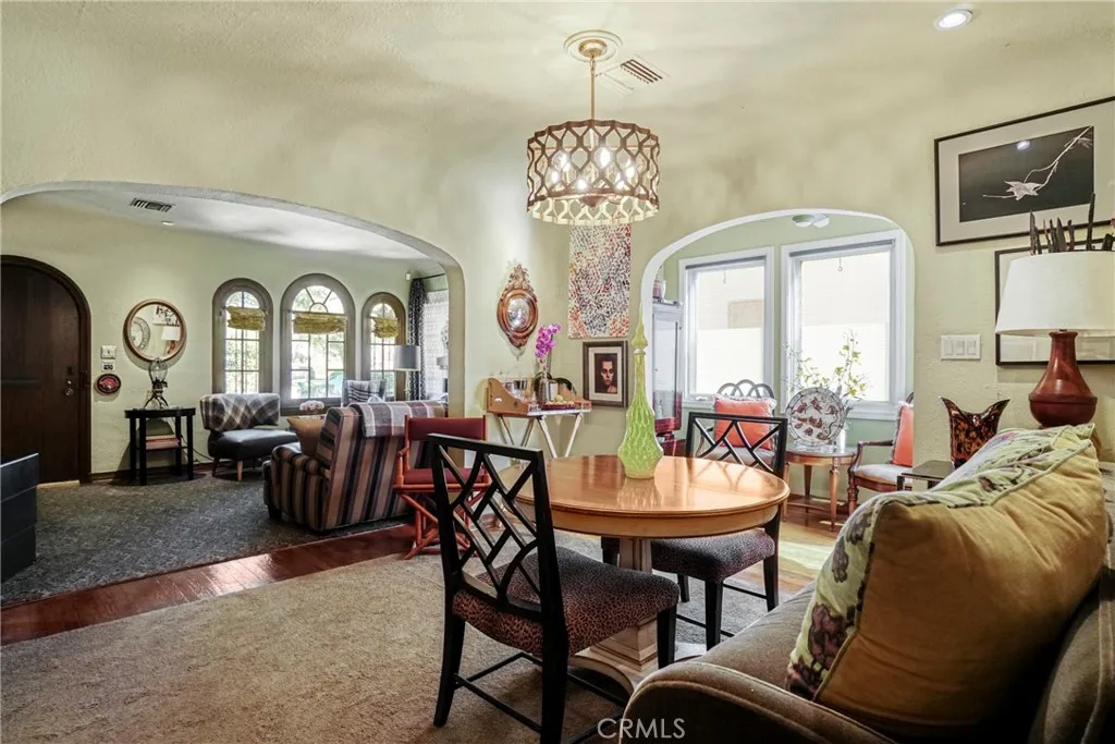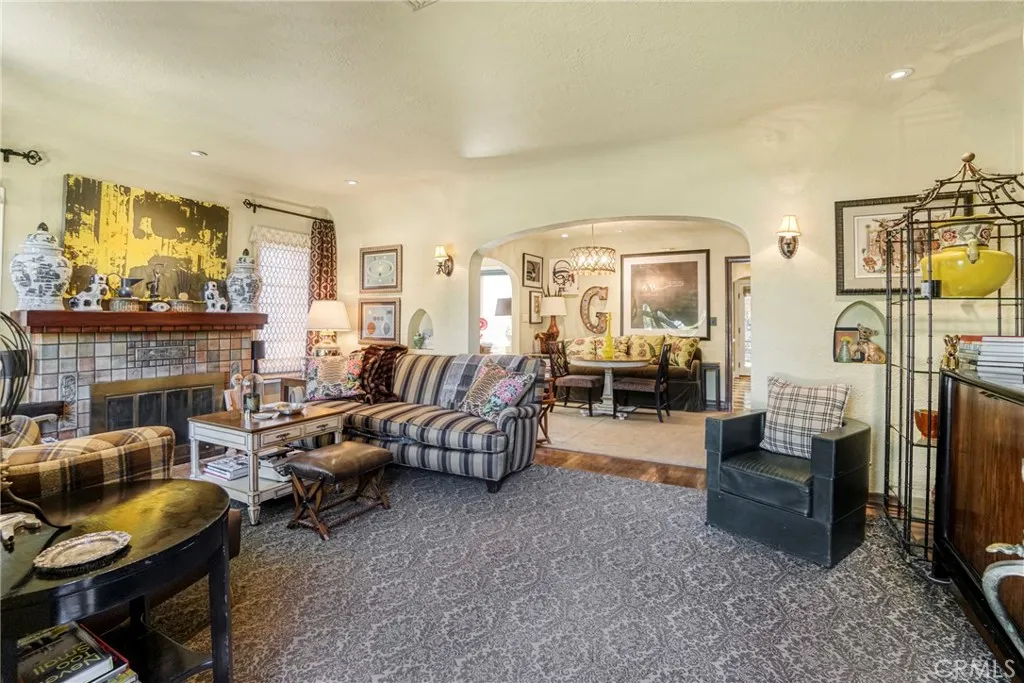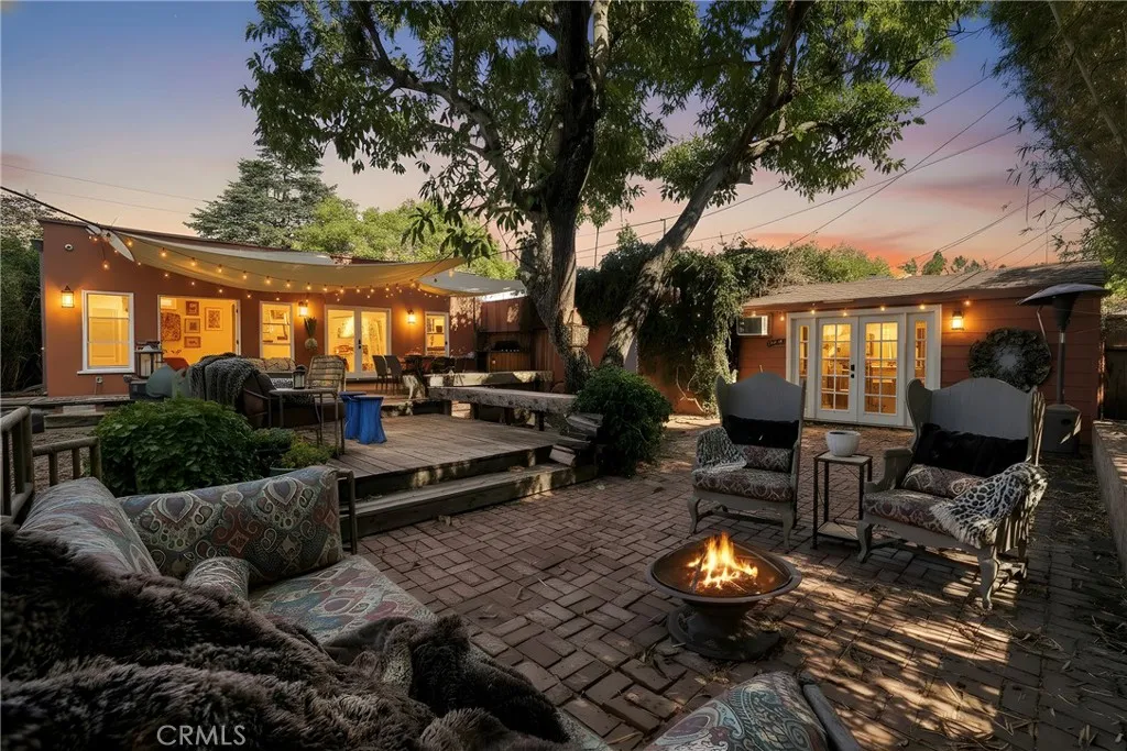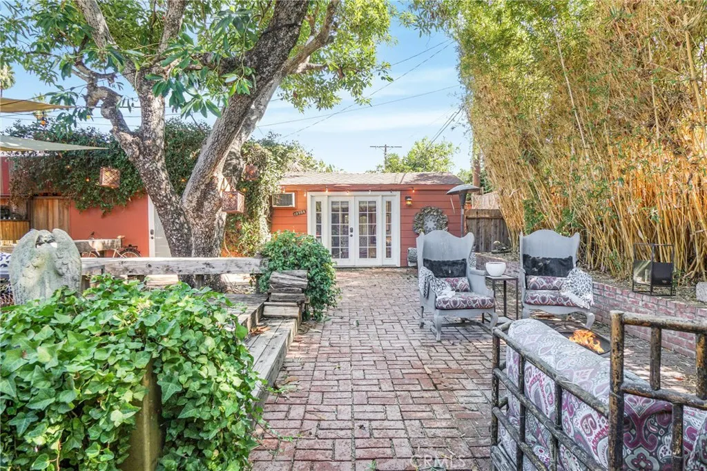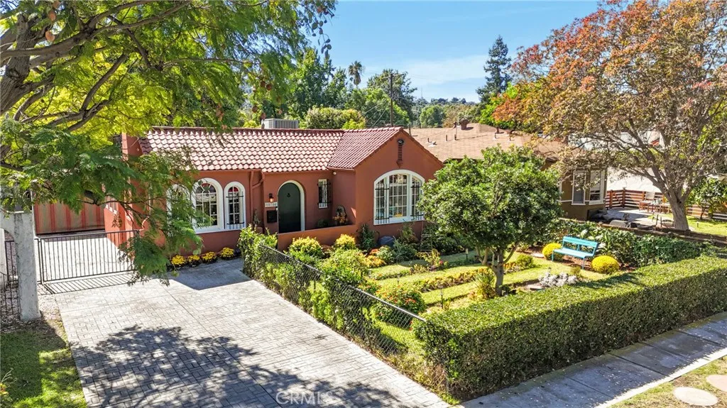 This 1925 Spanish-style artist retreat home blends original character with modern updates. The living room features an original California tile gas fireplace, vintage plaster walls, and original windows. The dining room connects to a small sunroom with casement windows. The kitchen is equipped with under-counter lighting, stove is dual fuel gas on top with electric oven, stainless steel appliances, butcher block and granite counters, and a built-in china cabinet in the breakfast nook. The home offers two bedrooms and two bathrooms with Cove ceilings in the living room and dining room. The guest bedroom has a vintage window, French door, and hardwood floors, while the primary bedroom provides backyard access and hardwood floors. The main bathroom has fresh paint and a cast-iron tub. Both bedrooms have ceiling fans, and the primary bedroom has 9-foot ceilings. With fresh interior and exterior paint, recessed lighting, and a new flat roof, this home also includes modern updates like a 2-ton AC unit with heat pump, 200-amp electrical service, newer plumbing, and a tankless water heater. A detached studio/office is attached to the single-car garage, which has extra storage space. The backyard features a inviting deck and brick terrace. This home is full of original charm and thoughtful updates, located in a fantastic area.