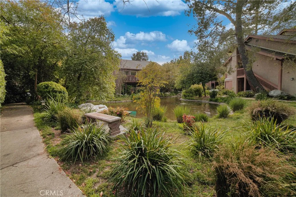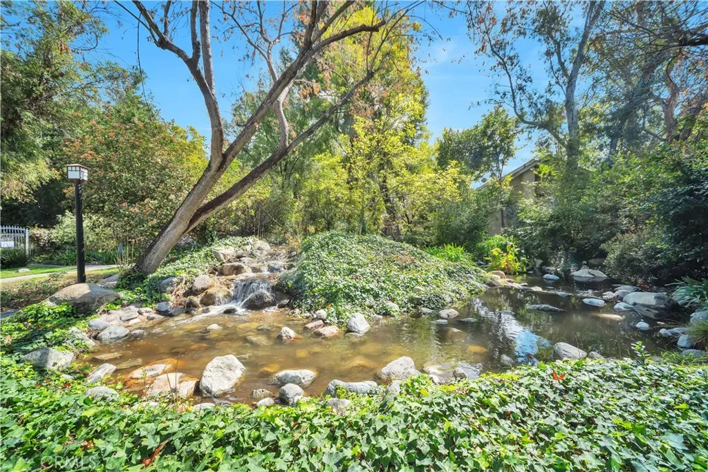 Canoga Lakes popular townhouse style model with no one above or below you. There are 2 assigned parking spots located conveniently close to the unit. Beautifully updated unit with remodeled Kitchen and baths and with premium vinyl plank flooring and recessed lighting. It is located in a tranquil spot with fruit trees and overlooking the soothing stream and lush landscaping and towering trees. Enjoy this wonderful setting on both the downstairs patio area and also from the balcony of the primary bedroom. Canoga Lakes is a gated resort-like community on 18 acres with water features, walking paths and beautiful scenery everywhere. HOA amenities include pools, spas, saunas, lighted tennis courts and work out room. Water, trash and earthquake insurance is covered in the reasonable HOA dues. It is located in a vibrant area with transportation, restaurants, shopping, and entertainment close by. This is a great unit and great community; you are going to love living in Canoga Lakes.
