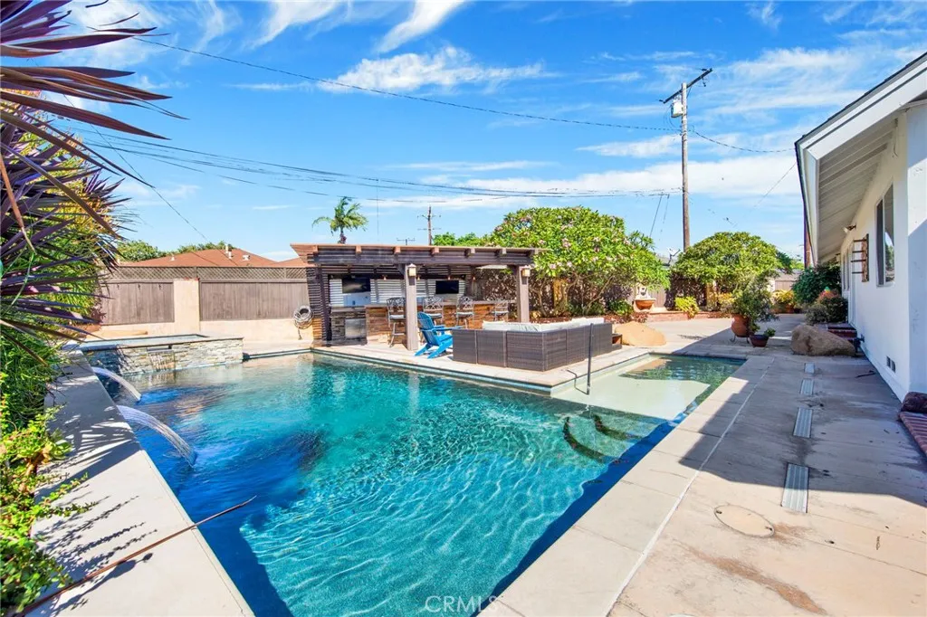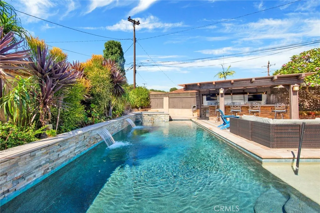 An Entertainers Dream in the Heart of Long Beach, 5025 E Los Coyotes is a stunningly remodeled residence that blends modern comfort with resort style living. This spacious 3 bed, 3.5 bath home offers an open and inviting layout, plus a bonus 400 sq. ft. flex space above the garage perfect for a junior ADU, home office, or guest suite. Step inside to find wide plank luxury laminate flooring, fresh interior and exterior paint, and a newly renovated kitchen featuring sleek cabinetry, stone countertops, and stainless steel appliances. The expansive great room seamlessly connects the living, dining, and kitchen areas ideal for both everyday living and large gatherings. The homes crown jewel is the backyard, a true entertainers paradise. Enjoy Californias indoor-outdoor lifestyle with a custom pool and spa, baja shelf for sunbathing, and a BBQ bar area with tons of seating all surrounded by lush landscaping for privacy and relaxation. An outdoor shower adds a touch of luxury after a swim or sauna session. Additional highlights include: Sauna for relaxation and wellness, Tesla wall charger, leased solar system with two Tesla Powerwalls, ample driveway and garage parking, updated bathrooms with designer finishes. Located on a wide, tree-lined street in East Long Beach, this home offers easy access to shopping, dining, golf courses, parks, major freeways and top-rated schools. Experience the perfect blend of comfort, sophistication, and California living this is the entertainers dream youve been waiting for.