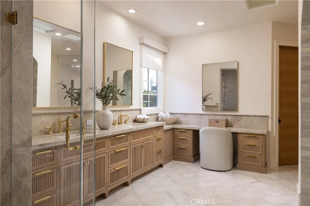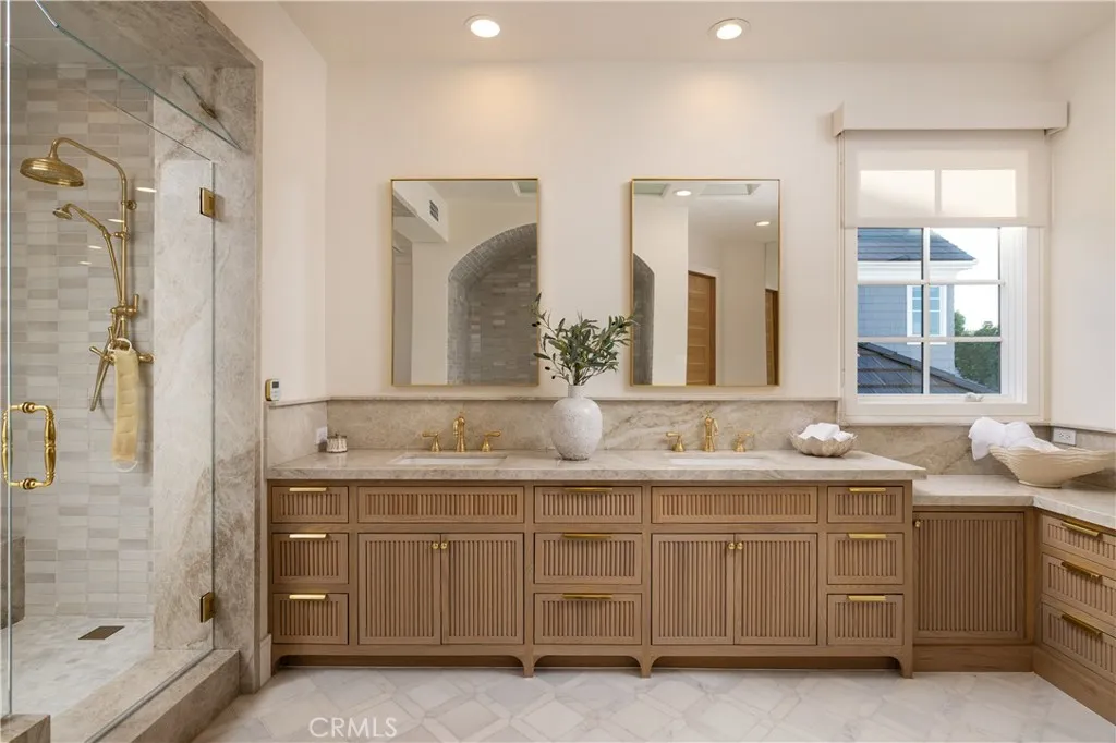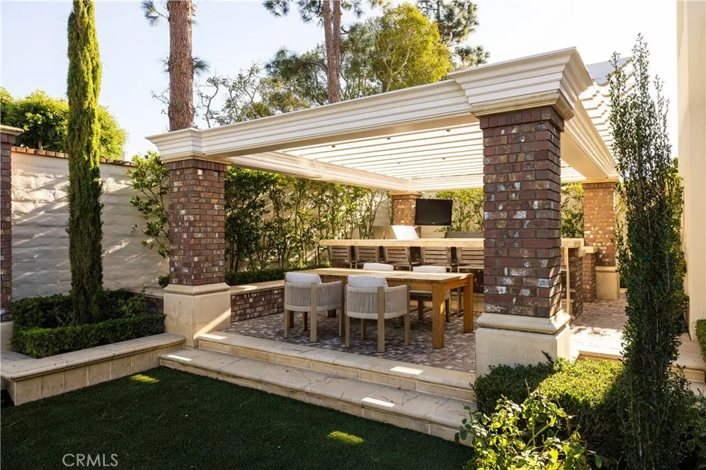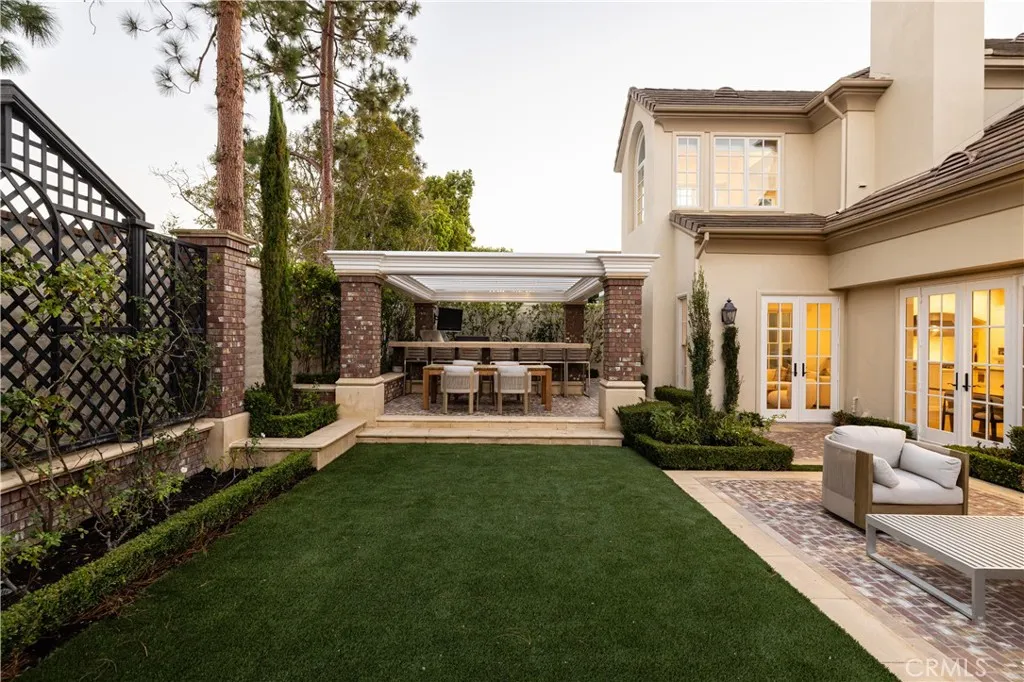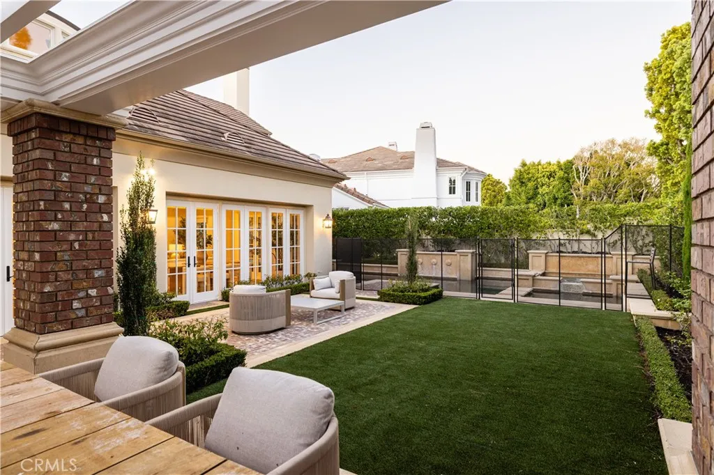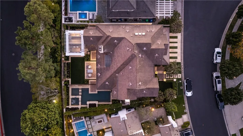 Ideally situated on a private cul-de-sac in one of Newport Beach's most sought-after guard-gated communities, One Ford Road, 8 Gleneagles Drive is the largest floor plan in the neighborhood and offers rare privacy with no home directly behind it. Extensively updated and impeccably maintained, this Providence Model spans nearly 5,200 square feet and showcases timeless elegance with Venetian plaster walls and white oak floors throughout. The home opens with a gracious foyer leading to a formal office, a light-filled living room with fireplace, and an elegant dining room designed for refined entertaining. The chefs kitchen flows seamlessly into the family room and casual dining area, all centered around a warm stone-clad fireplace. Five total bedrooms include a main-level suite and an expansive upstairs primary wing, featuring a private sitting area with fireplace, a flexible bonus room, and a spa-like bathroom with natural stone finishes, dual vanities, and two spacious walk-in closets. Three additional en-suite bedrooms and a central retreat area offer ample space for family or guests. Designer finishes elevate every space, including mother of pearl tile in the powder room and custom window treatments throughout. Designed for indoor-outdoor living, the backyard is a resort-style escape with a pool and spa, outdoor kitchen, manicured gardens, and a dining arborperfect for relaxing or entertaining in a private setting. A spacious laundry room and oversized three-car garage complete the home. Residents of One Ford Road enjoy exceptional amenities including two swimming pools, a