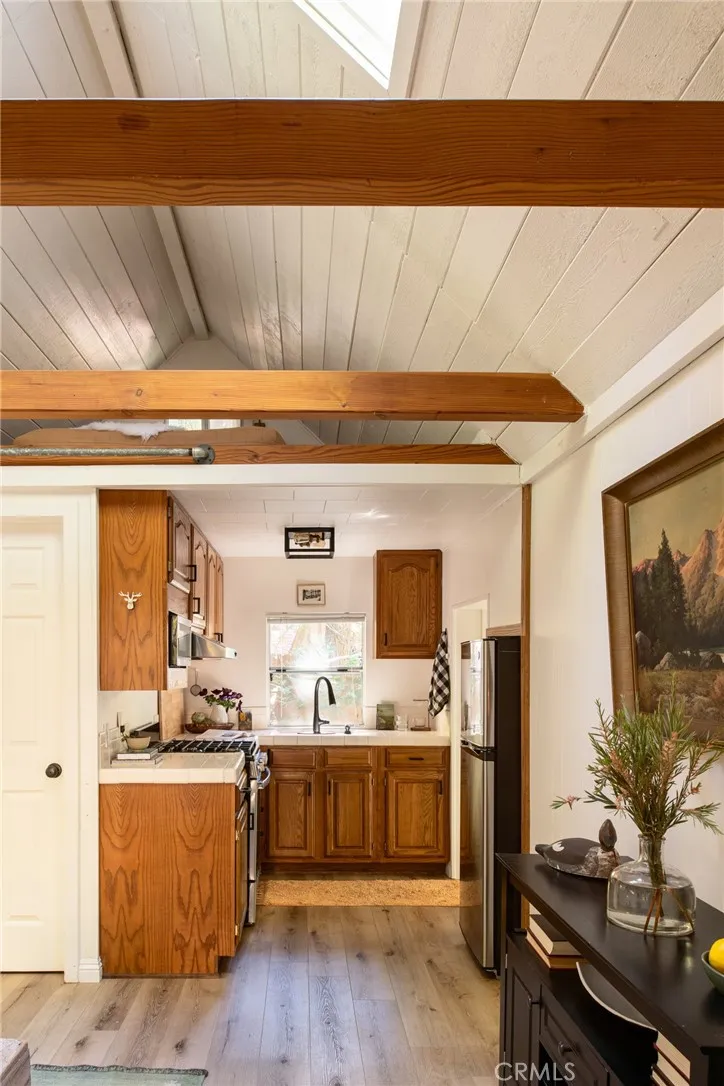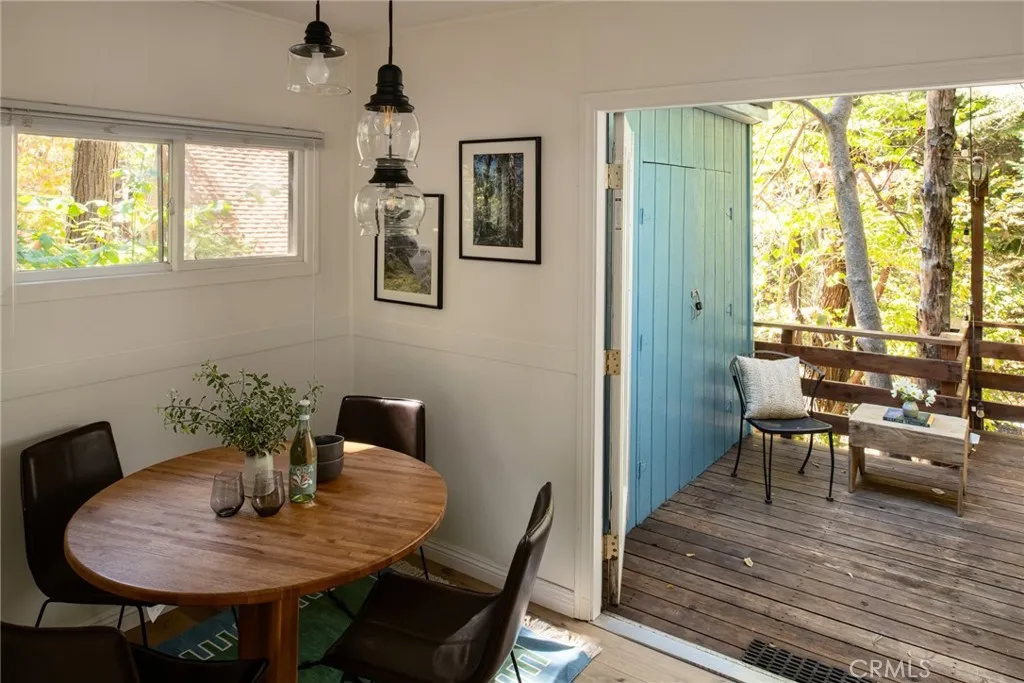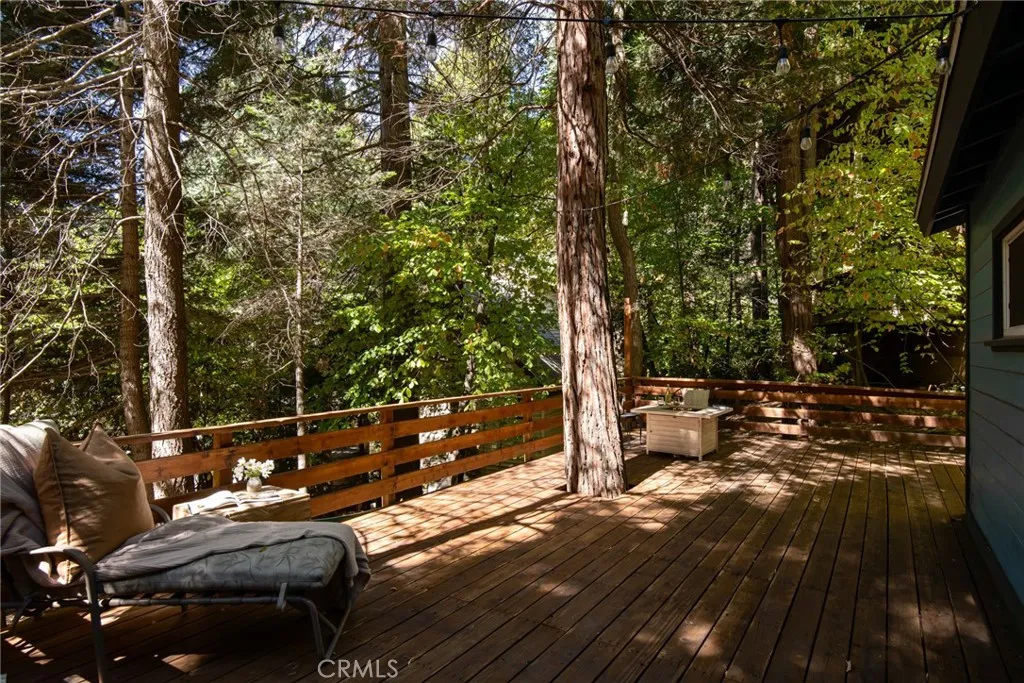 Back on Market at No Fault to Seller! Welcome to the perfect little cottage tucked away in its own private forested haven. This home offers a rare sense of peace and seclusion, situated on a large, usable lot surrounded by majestic dogwoods, cedar, and white fir trees, this home offers serene mountain living at its finest. Step outside and discover what truly sets this property apart: the expansive wraparound deck. Nestled under the canopy of mature mountain trees, this outdoor space feels like your own private treehouse A flat areacurrently used for a swing setprovides a versatile space ideal for additional outdoor seating, a firepit lounge, or garden. Access the property via your own private two-car carport located on Lake Dr., leading you down into this enchanting woodland retreat. Step through the French double doors into a warm and inviting living room, featuring vaulted ceilings with exposed beams, skylights, and a cozy wood-burning stove. The upgraded kitchen flows seamlessly into the living area, perfect for entertaining. Just a few steps down, youll find a charming dining room with its own set of French doors opening to the deck, creating a beautiful indoor-outdoor living experience. The private bedroom is cozy and tucked away, complete with sliding glass doors for direct access to the deck. Upstairs, a carpeted loft offers an additional sleeping spaceideal for guests or a quiet reading nook. Ideally located in the Arrowhead Villas community, this home is just a short distance to Lake Arrowhead and Skyforest, home to local favorites like LouEddies Pizza, Skypark a
