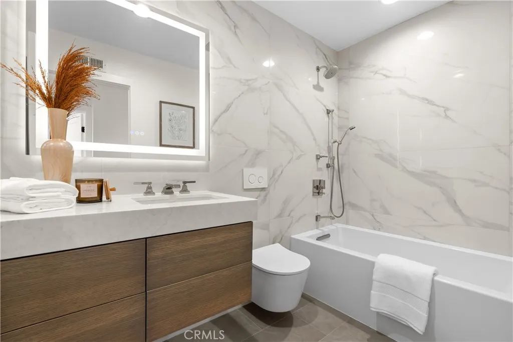 Completely remodeled coastal home in the gated community of Bayview Terrace. This 3-bedroom, 3-bathroom residence offers 1,625 sq. ft. of refined living space with high-end finishes throughout. The open floor plan connects the kitchen, dining, and family areas, creating a seamless flow anchored by a cozy fireplace. The expanded kitchen showcases Walker Zanger quartz countertops, a waterfall island, Monogram appliances, Zephyr vented hood, and a Kohler farmhouse sink with touchless faucet. Additional features include a remodeled laundry room with quartz countertops, new LG washer and dryer, custom garage cabinetry, cedar-lined closets, and a new HVAC system relocated to the attic with full re-piping and water-treatment plumbing. The home also offers new flooring, paint, interior doors, trim, and hardware throughout. Bathrooms showcase a curated mix of luxury finishes, including custom vanities, Walker Zanger tile, Restoration Hardware and Waterworks fixtures, Kohler and Toto toilets, and electric mirrors for a refined, spa-like experience. Outside, enjoy new landscaping with lighting, Orco pavers, and a custom front door and railing. Located in one of Newport Beachs most desirable neighborhoods with private access to Back Bay trails, and just minutes from beaches, Fashion Island, and top-rated Newport Mesa schools. Community amenities include a pool and spa.