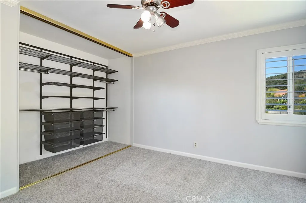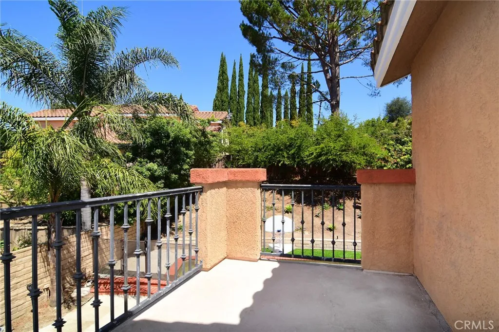 Nestled on a quiet cul-de-sac, this stunning Wood Ranch Regalia residence offers soaring ceilings, abundant natural light, and a spacious yet private backyard retreat. Relax by the serene Pebble Tec pool and spa while enjoying the diverse wildlife that call the hillside trees and shrubs home. Inside, youll find a rare main-floor multi-purpose bonus room with vaulted ceilings, a wall of built-in cabinetry, a bar sink, and two sets of double doors opening to both the formal dining room and the pool areaperfect as a home office, artist studio, gym, guest suite, or cabana bar. The upgraded kitchen features slab granite countertops, stainless steel appliances (including refrigerator and a back-saving double-drawer dishwasher), breakfast bar, and an oversized walk-in pantry. The downstairs bedroomcurrently used as an officeoffers soundproofed walls, double French doors, beautiful Acacia wood floors, and built-ins. A full shower bath is conveniently located nearby, along with a laundry room (washer and dryer included). Upstairs, rich Acacia wood floors flow through the hallway and primary suite, with newer carpet in the secondary bedrooms. The primary suite features a walk-in closet, water closet, double-sink vanity, and new decking off its expansive balcony. A second balcony is shared by one of the secondary bedrooms. Both upstairs baths feature newer wood-look tile, and a whole-house fan with timer adds comfort and efficiency. This home also includes solar, providing significant energy savings year-round, along with a large poolside cabana perfect for entertaining. Move-in ready