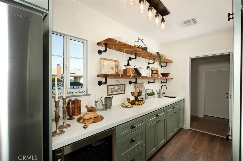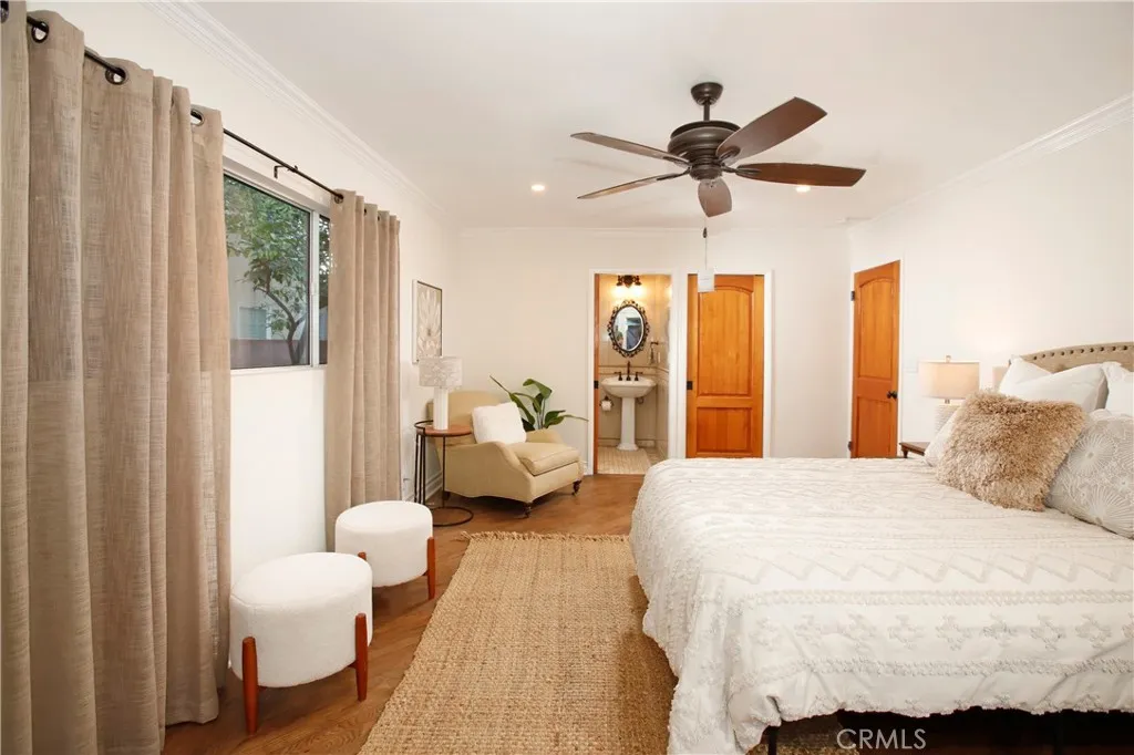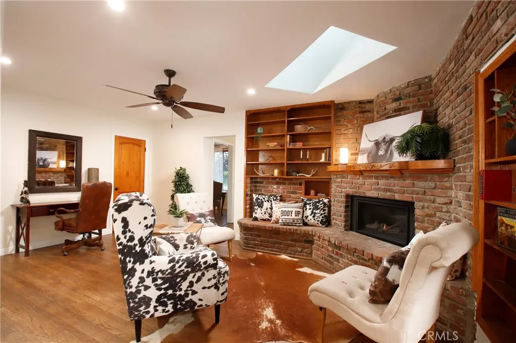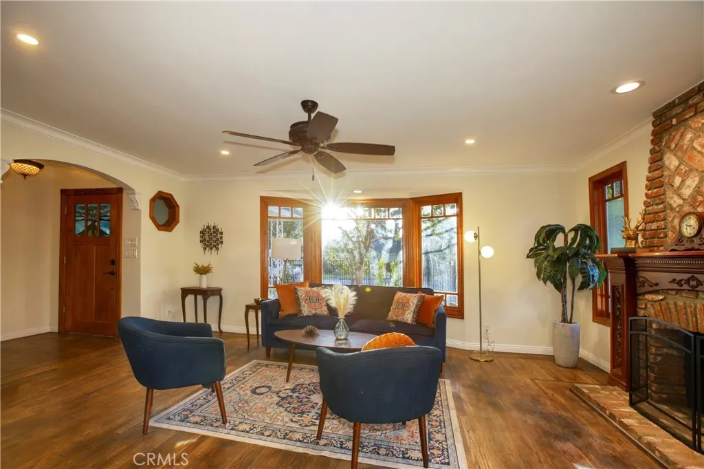 Classic California living in an enclave of well-established residences, this timeless home showcases the artistry, design, and craftsmanship of a bygone era. From the manicured landscaping to the panoramic picture window and color-saturated stained glass panels of the Arts & Crafts front door, every detail captivates. A formal entry welcomes you in and invites you to pause. Your eyes are drawn to the handcrafted herringbone brick fireplace framed by glass sidelights. You immediately experience the difference in the details rich inlaid hardwood floors, architectural corbels, solid wood doors, classic moldings, and spectacular fireplaces reflect enduring quality. The expansive chefs kitchen blends modern luxury with vintage charm, appointed with custom-built sage soft-close cabinetry, gleaming carrera quartz countertops, beveled subway tile backsplash, new stainless dishwasher and French-door refrigerator, and an abundance of storage. The coveted butlers pantryideal for entertainingincludes a wine and champagne refrigerator, open wood shelving, prep sink, and designer fixtures make this space unforgettable. A sprawling floor plan flows to inviting rooms and gathering spaces, including a cozy den with built-in shelving and skylight perfect for quiet moments, new memories, and relaxed living. Two generously sized bedroom suites provide flexibility for multi-generational living: one with a private balcony, the other with ensuite bath and French doors opening to a serene backyard retreat. Enjoy evenings under the covered cabana, with screens and curtains for comfort and privacy
