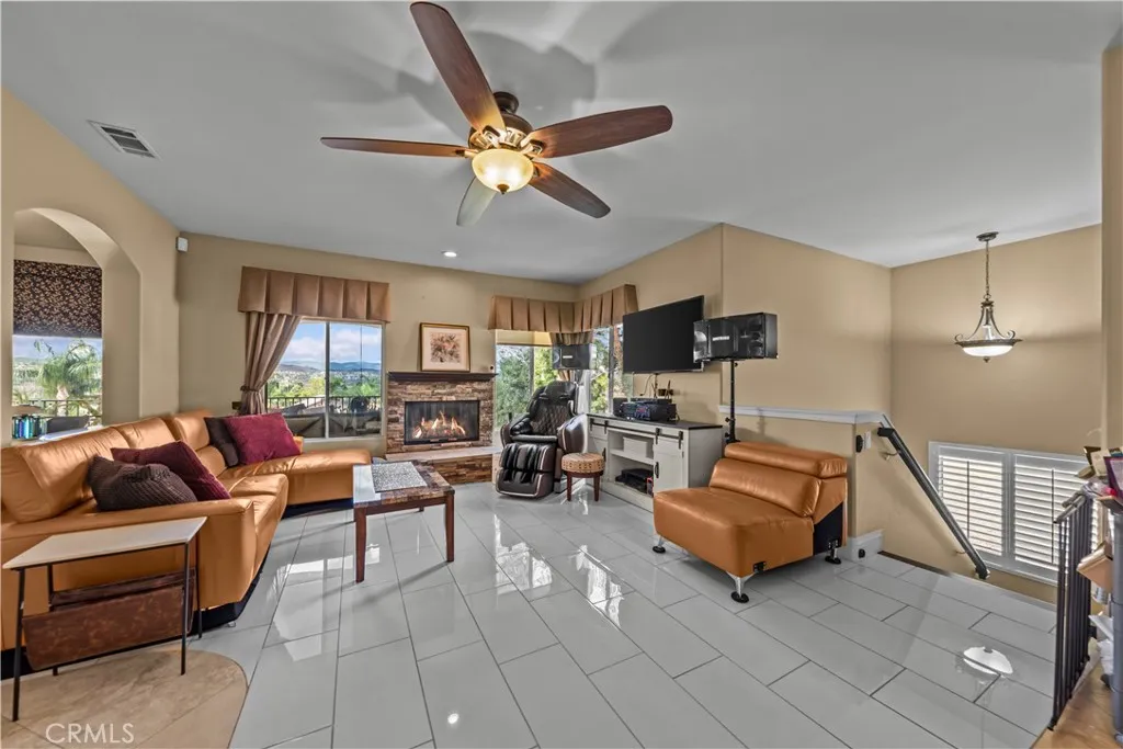 Experience the art of refined lakefront living in this extraordinary Mediterranean Villa a residence where elegance, comfort, & California sunshine converge. Tucked within the prestigious gates of Canyon Lake, Southern Californias premier private waterfront community, with one of the BEST views of their renowned fireworks extravaganza, this home has been designed & maintained w/ impeccable attention to detail, inviting you to live a lifestyle defined by serenity, sophistication, & effortless beauty. Step through ornate double iron doors into over 4,270 square feet of living space that unfolds across sun-drenched rooms adorned with porcelain, travertine & hardwood flooring, 4 custom fireplaces + sweeping views of the Cleveland National Forest. The interiors warm Mediterranean palette is balanced by refined architectural lines, giving the home a timeless sense of grace. The gourmet kitchen is the heart of the home a culinary retreat framed by imported Italian cabinets & polished granite countertops & beautiful appliances. An adjacent breakfast nook opens to an airy terrace with smart retractable awnings, inviting mornings filled w/ coffee & mountain breezes. Upstairs, the primary suite is a true sanctuary complete w/ private fireplace, balcony, and a spa-inspired ensuite where a $10k freestanding cast-iron soaking tub glows beneath a Schonbek crystal chandelier. Dual vanities, custom cabinetry and glass-enclosed shower complete the experience of indulgence. With 5 bedrooms, 4 bathrooms & 2 private offices, this villa offers both space & flexibility. The lower level has its