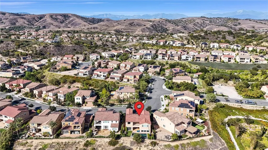 Welcome to 2488 Kern River, a stunning luxury residence in one of Breas most desirable hillside communities ~ Blackstone ~ where modern elegance meets breathtaking 180-degree panoramic views of city lights, Orange County skylines, and Disneylands nightly fireworks. As you arrive, a professionally paved driveway leads to a spacious 3-car garage & flagstone courtyard, offering beautiful curb appeal and a sense of timeless sophistication. Inside, the home blends warmth and refinement throughout its 5 bedrooms and 5.5 bathrooms. The main level features engineered hardwood floors, while the upper level showcases luxury vinyl plank flooring and new interior paint for a crisp, modern feel. Window shutters adorn most rooms, complemented by select roller shades for soft light control. The chef-inspired kitchen boasts a built-in refrigerator, large walk-in pantry, and a dedicated workspace ~ perfect for planning or organizing. An adjacent open great room flows seamlessly to the outdoor retreat, creating the perfect backdrop for entertaining. Enjoy the best of Southern California living in your own private courtyard with pool, built-in BBQ, and low-maintenance landscaping, highlighted by planters with artificial grass and lush accents for year-round beauty. The downstairs guest suite offers comfort and privacy with its own bathroom, plus an additional powder room for guests. Upstairs, the spacious loft can easily be converted into a primary retreat, home office, or kid's playroom/ study room while the private balcony off the retreat captures mesmerizing city-light views that stretch a