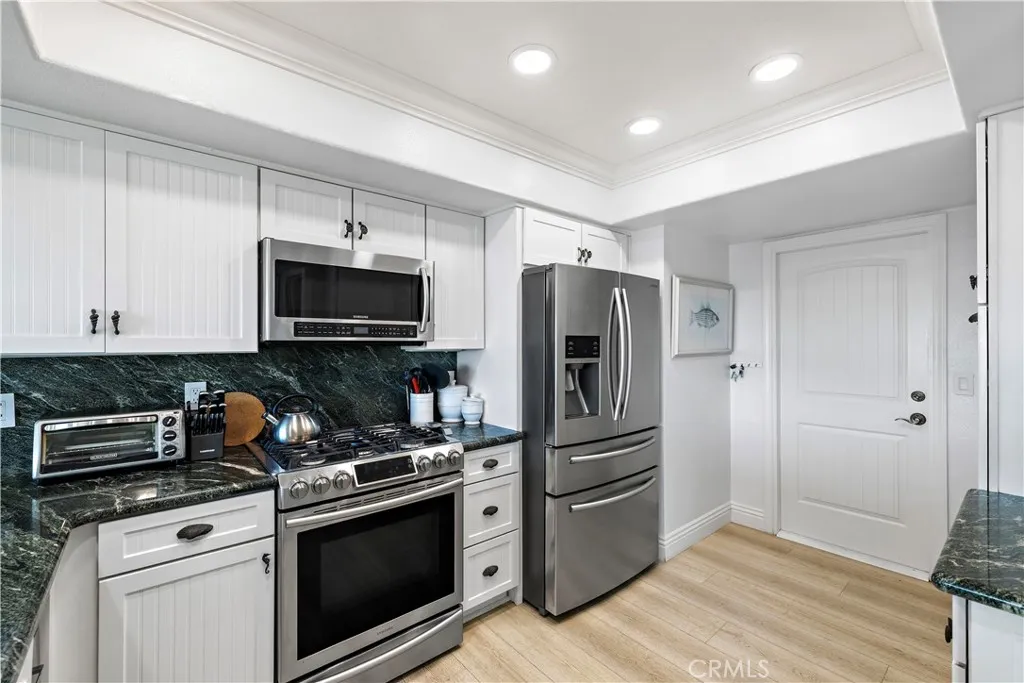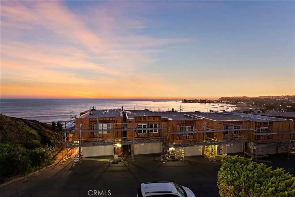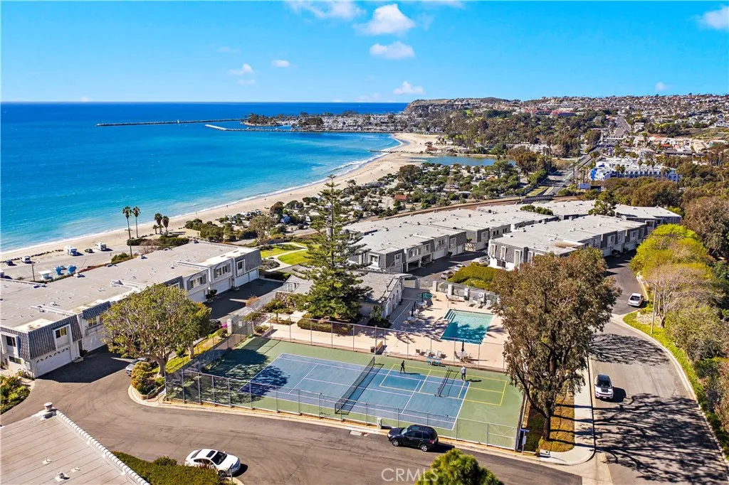 Discover your dream coastal retreat in this exceptional corner unit of the highly sought-after Dana Bluffs Community. Immerse yourself in breathtaking views of the ocean, Dana Point Harbor, Doheny Beach, and Catalina Island. This luxurious home invites you to a world of tranquility and elegance. Step into an elegantly designed open floor plan that seamlessly connects the living room, dining area, and kitchen. The living room exudes comfort and style with its custom granite fireplace, setting a sophisticated tone. The adjacent dining area provides a welcoming space for cherished meals, while the kitchen is a chefs dream, equipped with stainless steel appliances, Kraftmaid cabinets, and custom granite countertops that harmonize beautifully with the fireplace. The homes new luxury vinyl flooring adds a touch of durability and elegance throughout. Unique touches like the custom etched glass window with wave designs on the landing infuse the space with a coastal charm. Upstairs, two spacious master suites await, each with ample storage in its large mirrored closets. The primary master suite is a true haven, opening onto a deck with panoramic views and an electric awning, where you can relax and unwind to the soothing sounds of the waves. Practicality is ensured with the two-car garage, featuring ample storage cabinets, a new water heater, a washer and dryer, and a freshly epoxy-coated floor. The Dana Bluffs Community offers exclusive amenities, including a heated pool, spa, tennis and pickleball courts, and a clubhouse with breathtaking coastal views. Just minutes from local bea