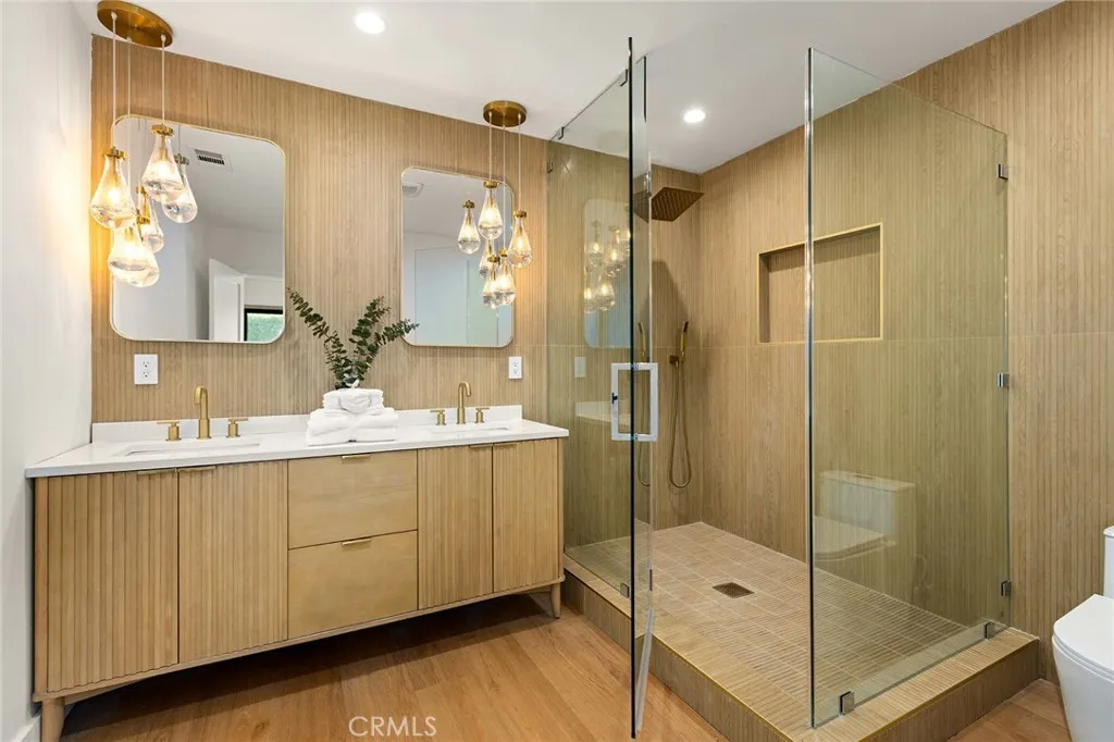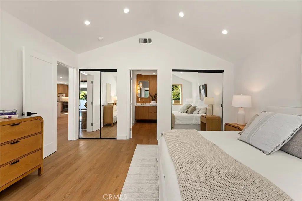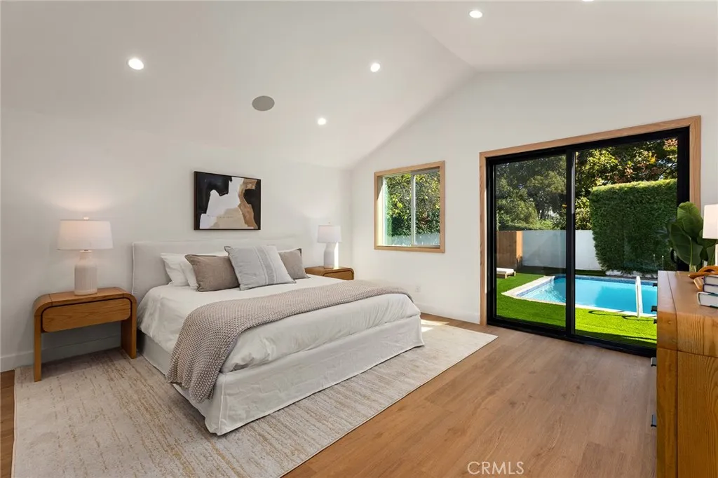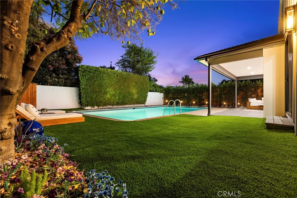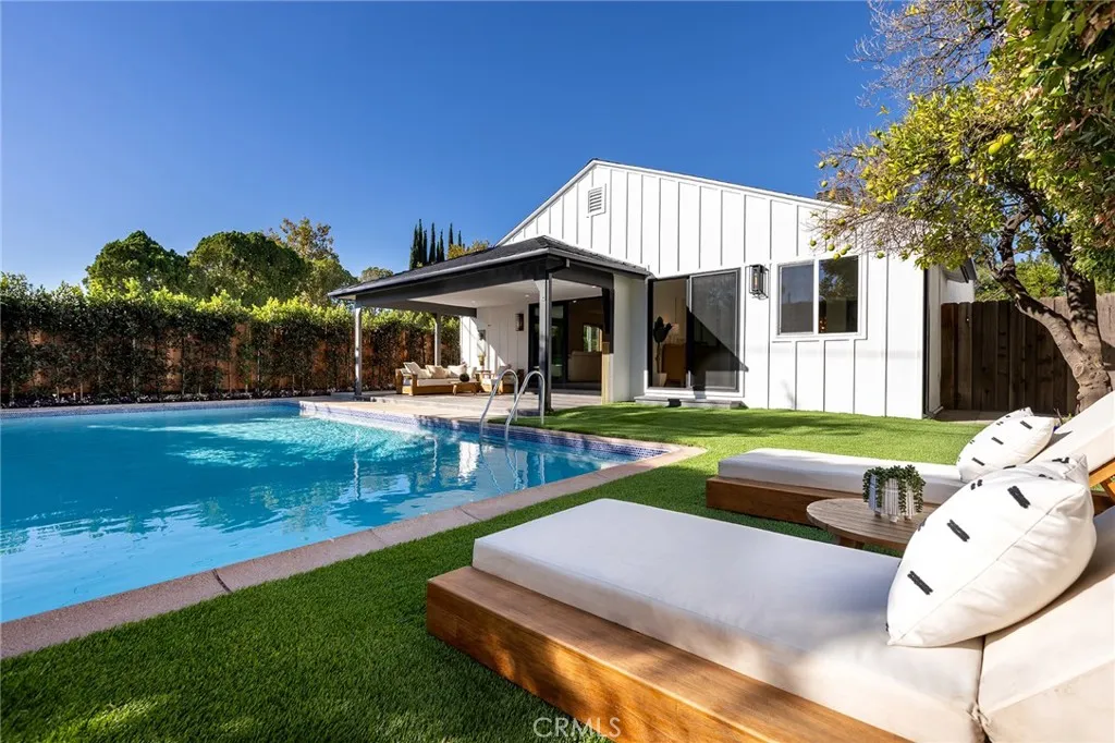 Welcome to your private retreat in Sherman Oaks, a stunning 3-bedroom, 2.5-bath luxury home on a serene corner lot with 2,041 square feet of beautifully designed living space. Behind the gates, youll find an open floor plan filled with natural light, cathedral ceilings in the living room and primary suite, and elegant honey oak wood floors throughout. The kitchen features custom cabinetry and high-end finishes that add warmth and sophistication. A large three-panel sliding glass door opens to a private backyard oasis with a sparkling pool, artificial turf, and a covered patio with a fireplace and TVperfect for relaxing or entertaining friends and family. The property also includes a spacious front yard with artificial turf, providing plenty of room for outdoor gatherings, kids play, or hosting lively summer parties. This home is equipped with six surround sound speakers controlled by an iPad, recessed lighting throughout, and a finished garage with epoxy floors and built-in lighting, ideal for a gym, office, or game room. Surrounded by mature ficus trees that create total privacy, this home combines comfort, style, and smart design for effortless living. Adding even more appeal, this home is located near Kester Avenue Elementary School, a highly regarded neighborhood school known for its excellent academic programs, dedicated teachers, and strong sense of community.