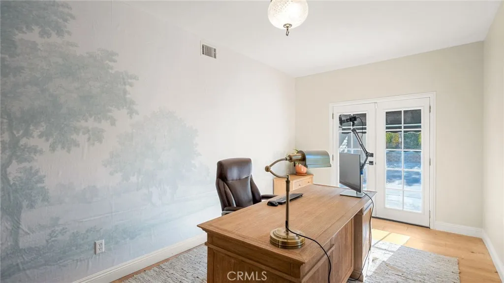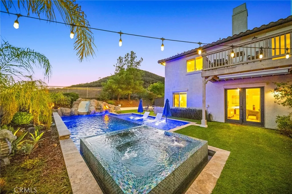 Welcome to this stunning 4,120 sq. ft. bespoke luxury home in the prestigious guard-gated community of Greer Ranch. Thoughtfully designed for both elegance and livability, this residence offers 5 bedrooms, 4.5 baths, plus a dedicated office, all showcasing breathtaking views of the Murrieta and Temecula Valley at the top of Greer Ranch. The open and inviting floor plan features a main-floor mother-in-law suite with its own living area, bedroom, and private bath perfect for guests or multi-generational living. The gourmet kitchen shines with granite countertops, stainless steel appliances, and refinished wood flooring laid in an elegant herringbone pattern, opening seamlessly to the family room and breakfast nook for effortless entertaining. Throughout the home, all flooring has been beautifully redone, enhancing the cohesive, modern feel and complementing every space with refined style. Upstairs, the primary suite serves as a tranquil retreat with sweeping views, a spa-inspired bathroom, and an oversized walk-in closet. Three additional bedrooms, including a private guest suite, offer comfort and flexibility for family and friends. Step outside to your resort-style backyard oasis, where luxury and leisure meet. Enjoy a newer custom osmosis pool and spa with a PebbleTec finish and soft pool lighting, creating the perfect evening ambiance. The outdoor space features a balanced mix of concrete and lush artificial turf, ideal for both entertaining and everyday relaxation while taking in the spectacular valley views. Additional highlights include solar power for efficiency and