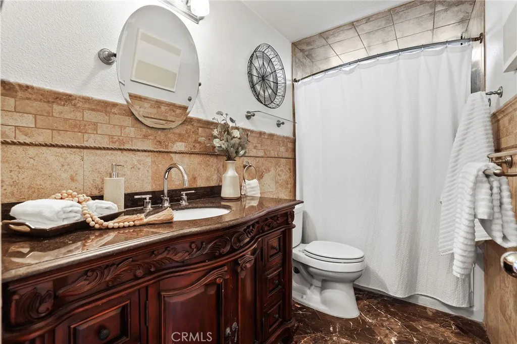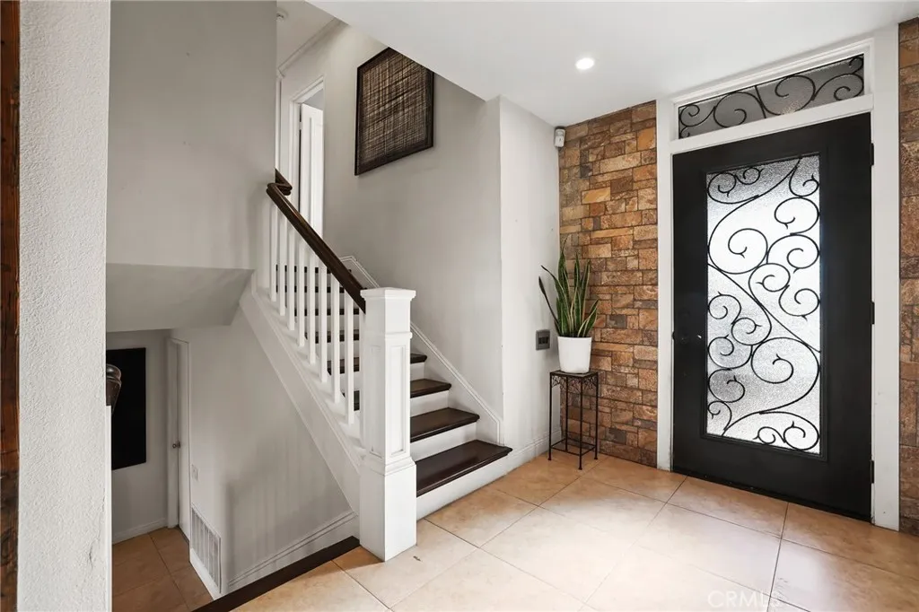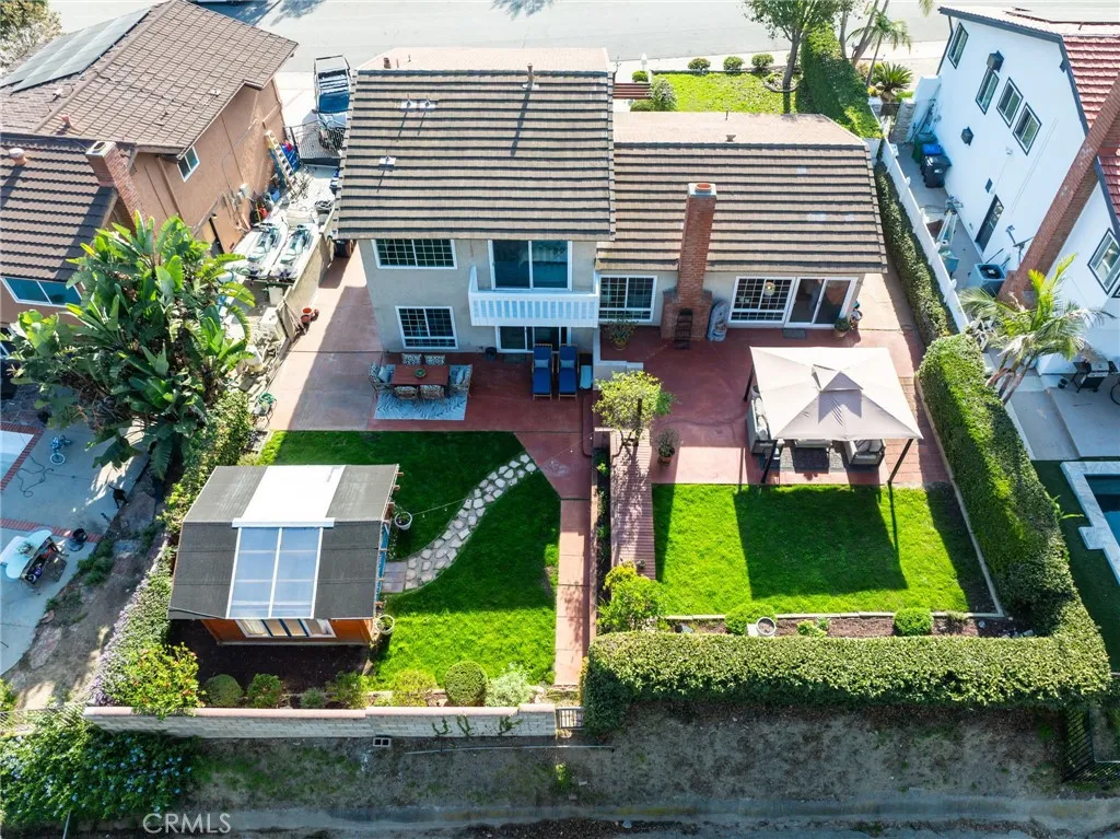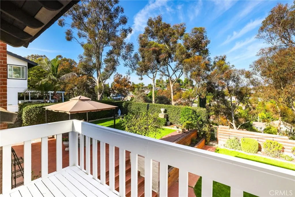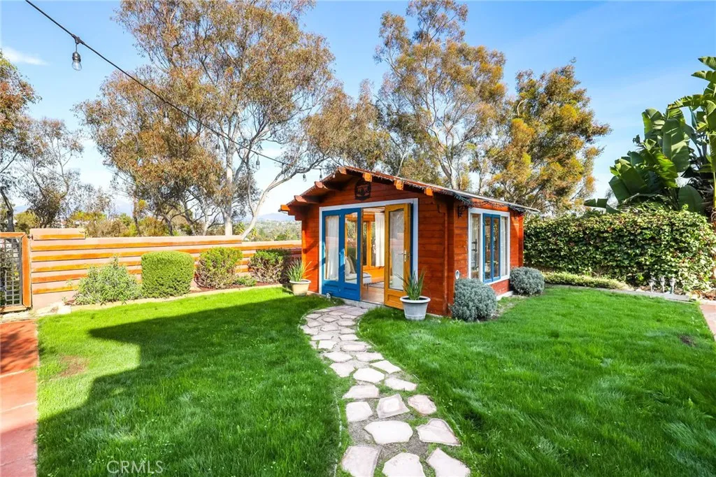 Looking for a home with a spacious, private yard and stunning panoramic views? Youre in the right place! Step into a private backyard retreat thoughtfully designed across two tiers to balance function and flow. The upper level features flourishing orange and lemon trees alongside an open patio and sunny grassy yard, creating a perfect space for relaxing or entertaining. The lower tier offers additional room to enjoy the outdoors in peace and privacy. Down below, enjoy a covered patio ideal for year-round gatherings, plus a detached studio currently set up as a dance and workout space a perfect home gym, office, or guest suite. Surrounded by privacy and scenic views, this outdoor space is more than just a yard, its where everyday life meets possibility. Inside, the sun-drenched great room welcomes you with vaulted, beamed ceilings, tile flooring, recessed lighting, and a cozy fireplace that anchors the space in warmth. The gourmet kitchen is designed for connection, featuring stainless steel appliances, rich wood cabinetry, a farmhouse sink, granite countertops, and a spacious center island, all seamlessly connected to the outdoors through French doors that open to a tranquil side yard. Downstairs, a flexible freshly painted second living area includes custom built-ins, natural light, and a private bedroom with en-suite bath and walk-in shower, ideal for guests, in-laws, or a work-from-home setup. Upstairs, the primary suite is a serene retreat with laminate wood flooring, recessed lighting, and a beautifully refinished private balcony, along with an updated en-suite bathro