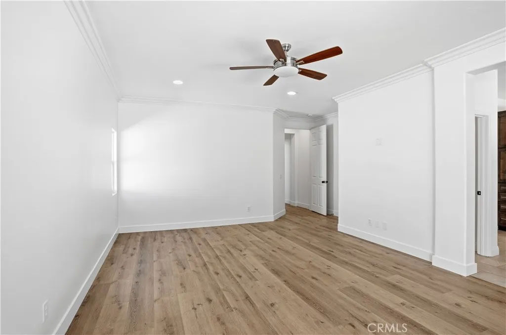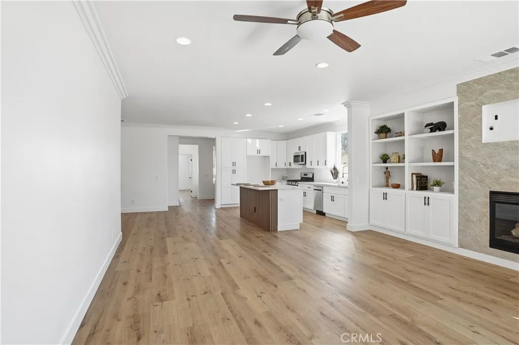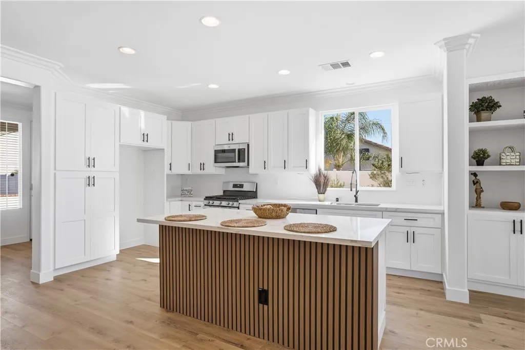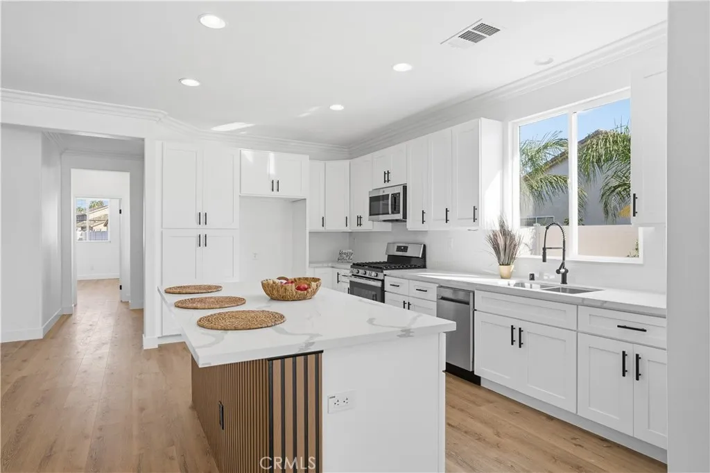 Great single family and totally upgraded home with access for side RV parking on a spacious lot of 10,018 SqFt. Conveniently located near park, shopping, schools and easy freeway access. As you enter the home into a FOYER area that offers privacy to the rest of the living area. The Spacious OPEN PLAN KITCHEN just renovated with new cabinets and self closing drawers, Quartz counters, Pantry with plenty of cabinet spaces, new appliances and a big kitchen island. LVP flooring throughout the house hallways bathrooms and bedrooms. Living room features a fireplace, a built-in media center and a 4 panel sliding glass door wall. The home also features ceiling fans and mirror closet doors. Hallway bathroom and master bathroom totally renovated with new quartz counters, New Cabinets, New Tubs, New plumbing fixtures and light fixtures. MASTER BEDROOM very spacious with a spacious walk in closet, ceiling fan and sliding glass door with access to the patio area. MASTER BATHROOM features a separate walk-in shower glass room and a jet tub for relaxation. LAUNDRY ROOM located inside complete with cabinets and access to garage. PATIO DECK is a big concrete area with lights and ceiling fans. FENCED completely with Vinyl fence panels. Exterior was just painted and hard landscaped. Assesor's records shows 3 bedrooms but there's an actual room with space for closet that is used as the 4th bedroom. Two car garage with extra space for storage.