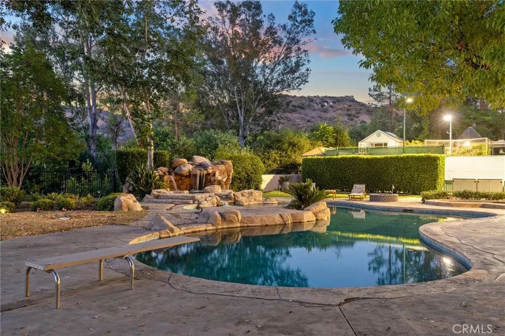 Stunning tennis court estate located at the base of the scenic Santa Monica Mountains, within the prestigious Countryside Estates community, adjacent to Paramount Ranch. Set on approximately one acre of lush, landscaped grounds, this home offers the ultimate in privacy, comfort, and resort-style living. Step into your own private backyard oasisperfect for entertaining or unwinding in paradise. Enjoy a full-size lighted tennis court, putting green, and a sparkling swimming pool with a waterfall and spa. Mature landscaping includes oak trees, redwoods, and 30+ rose trees. Inside, the home boasts 5 spacious bedrooms, including a junior suite on the main level with its own sitting area and ensuite bathideal for guests or multigenerational living. Upstairs, the primary suite features two walk-in closets, a private patio, and a cozy gas fireplace. Two additional fireplaces warm the formal living room and family room, adding ambiance throughout. The upgraded kitchen is a chefs dream with stainless steel appliances, a Thermador cooktop, and double oven. Recent improvements include new windows with 50/50 wide-plank plantation shutters, flooring, hand-made glass chandeliers, and whole home filtered water system, blending modern updates with timeless elegance. Situated on a peaceful cul-de-sac, the semi-circular driveway offers ample guest parking and plenty of space for RV parking. The third-car garage has been transformed into a fully equipped fitness/yoga studio. This exceptional property combines luxurious amenities, privacy, and an unbeatable locationtruly a rare offering in one