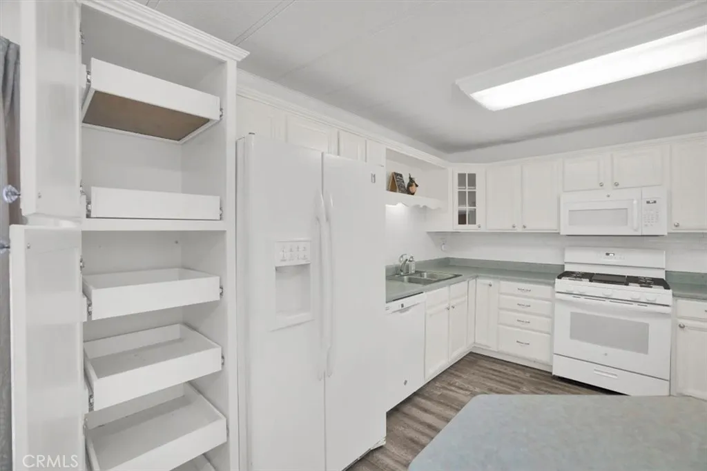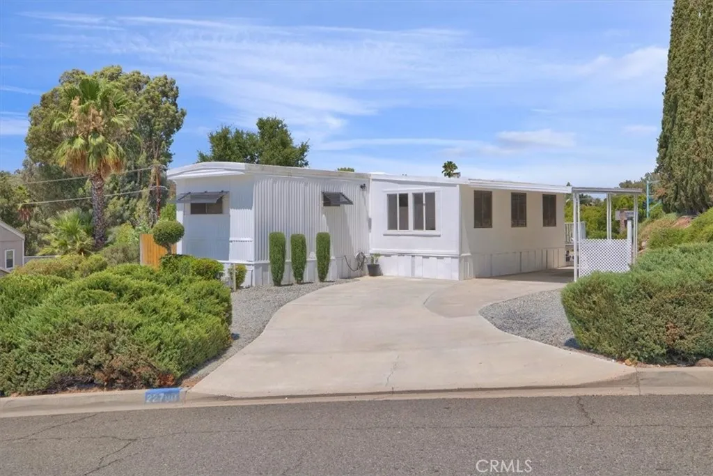 Have you been looking for affordable living in Southern California's premier, gated, waterfront community of Canyon Lake? Well look no further! This two bed, two bath home has plenty of features with a favorite being views of the golf course, surrounding community, local mountains and killer sunsets!! Welcome to the meticulously maintained 22780 Skylink Drive!! Upon entering you'll notice your living room offers an open and bright layout with updated wood plank vinyl flooring, 5" baseboards, and a flow directly into your kitchen and dining area. The kitchen offers newer appliances, 5burner gas cook top with grill in the middle, white oak cabinets, subway backsplash, a raised bar peninsula seating area, and full extension roll out shelves in almost all cabinets that offer ample storage! Your master bedroom hosts a healthy footprint with ample closet space, berber carpet and is located adjacent to the master bath with gorgeous counters and updated porcelain tile shower stall with grab bars for easy access! The spare bedroom has it's own en-suite half bath with wainscoting, wood plank vinyl flooring and plenty of closet space! Off the main living area and kitchen is your living room offering plenty of natural light and fres hpaint throughout. Other amenities include four new mini split AC system, new energy efficient 40 gal. water heater, indoor laundry, fenced rear yard area perfect for animals, covered aluminum patio in the rear, new rock/irrigation system/landscape, 6x10 storage shed, new mobile home piers under home for added support,raised 6 panel interior doors, covered