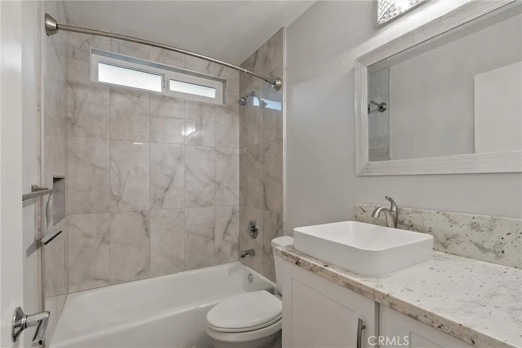 Step into this rare find a single-story condo that lives like a single-family home, sharing only one wall and offering both a front yard and a spacious, fully fenced backyard with mature citrus trees. Monthly HOA dues are a mere $150! Inside, youll find a wood beam cathedral ceiling with tongue-and-groove detail and exposed beams that add warmth and character. A brick wood-burning fireplace anchors the living room, creating a cozy focal point with views of the private backyard through large sliding doors. The kitchen blends farmhouse charm with modern touches: quartz countertops, plenty of workspace, and a 5-burner gas range that makes it a dream for home cooks. Matching stainless appliances refrigerator, microwave, and dishwasher plus frosted-glass pantry doors and space for a breakfast nook or rolling island make this kitchen both stylish and functional. The primary suite enjoys a separate entrance from the guest bedrooms, offering privacy and flexibility ideal for roommates, guests, or working from home. Down the hall, the two guest bedrooms share a nicely remodeled bath featuring a granite countertop and tile-wrapped shower/tub enclosure. Additional highlights include laundry hookups with electric dryer connection, a 1-car attached garage, and thoughtful details throughout. The private backyard is larger than youd expect for a condo perfect for gardening, pets, or relaxing under the trees. Between the sunny front yard, enclosed backyard, and single-level floor plan, this condo offers the comfort and independence of a home with the ease of condo living. Enjoy cathed