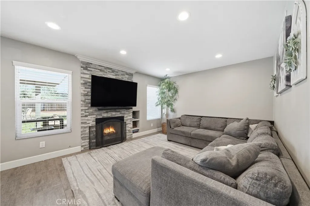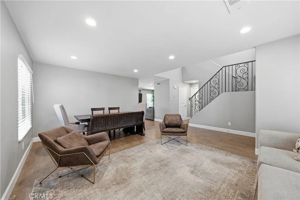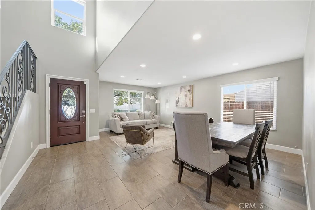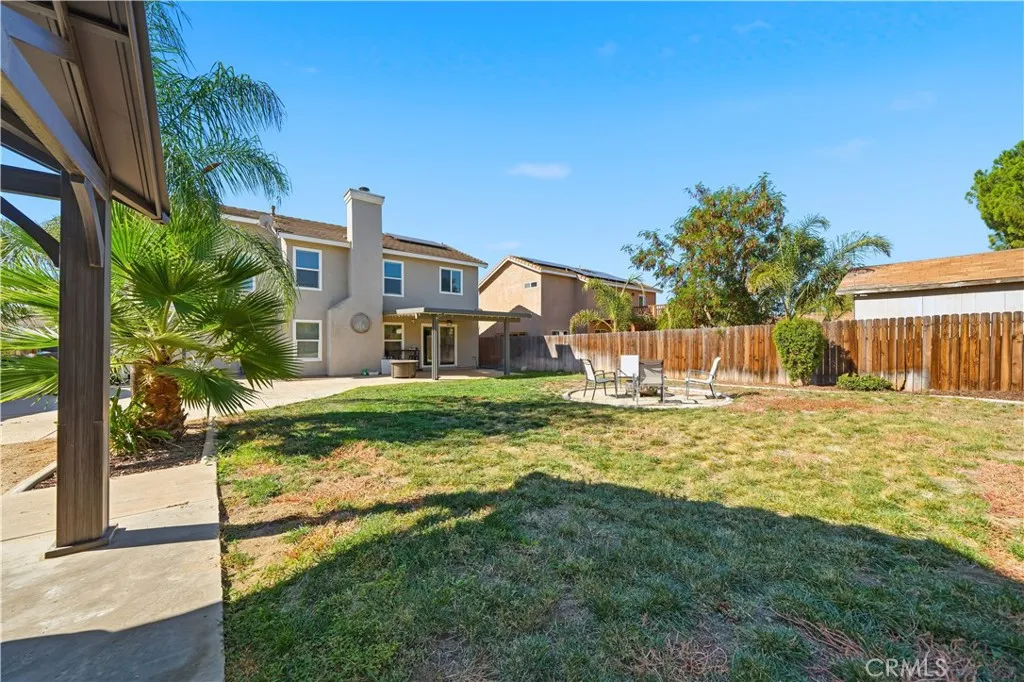 Beautifully upgraded 5-bedroom Murrieta home with no HOA or Mello Roos, featuring quartz-top kitchen, modern plank flooring, and a backyard with endless potential! Light, bright, and move-in ready, this home has been lovingly maintained and enhanced throughout with thoughtful upgrades that blend comfort, efficiency, and style. Step through the leaded-glass front door into a spacious great room that flows effortlessly into the formal living and dining areas. The kitchen impresses with gleaming quartz countertops, elegant glass backsplash, stainless steel appliances, gas stove, and a roomy pantry perfect for everyday meals or entertaining. A modern metal-scroll staircase leads upstairs to five generous bedrooms, including a spacious primary suite with vaulted ceilings, walk-in closet, and an upgraded bath featuring a stunning walk-in shower. The guest bath offers dual sinks, quartz counters, and a soaking tub, while a convenient half bath serves guests downstairs. Additional highlights include LED recessed lighting, dual-pane windows and doors, paneled interior doors, and a new garage door. The large backyard is your private retreat complete with lush green lawn, automatic sprinklers, covered patio with ceiling fan, bar area, palm tree, and an above-ground spa shaded by a pergola. Ideally located near top-rated schools, shopping, parks, and easy freeway access, this Murrieta gem truly has it all.