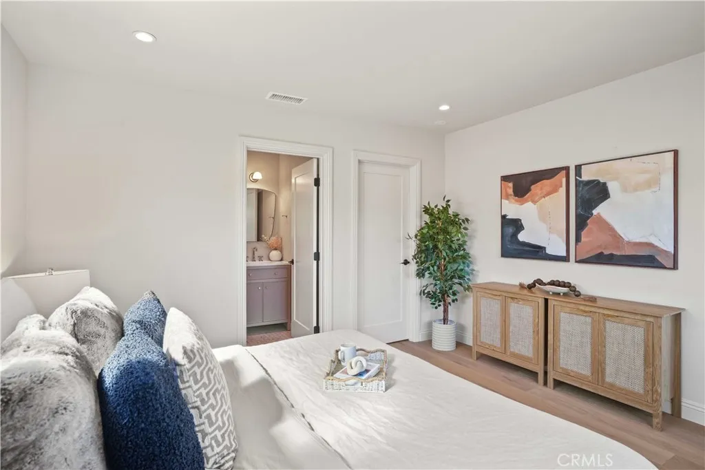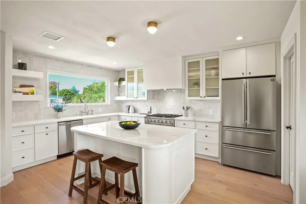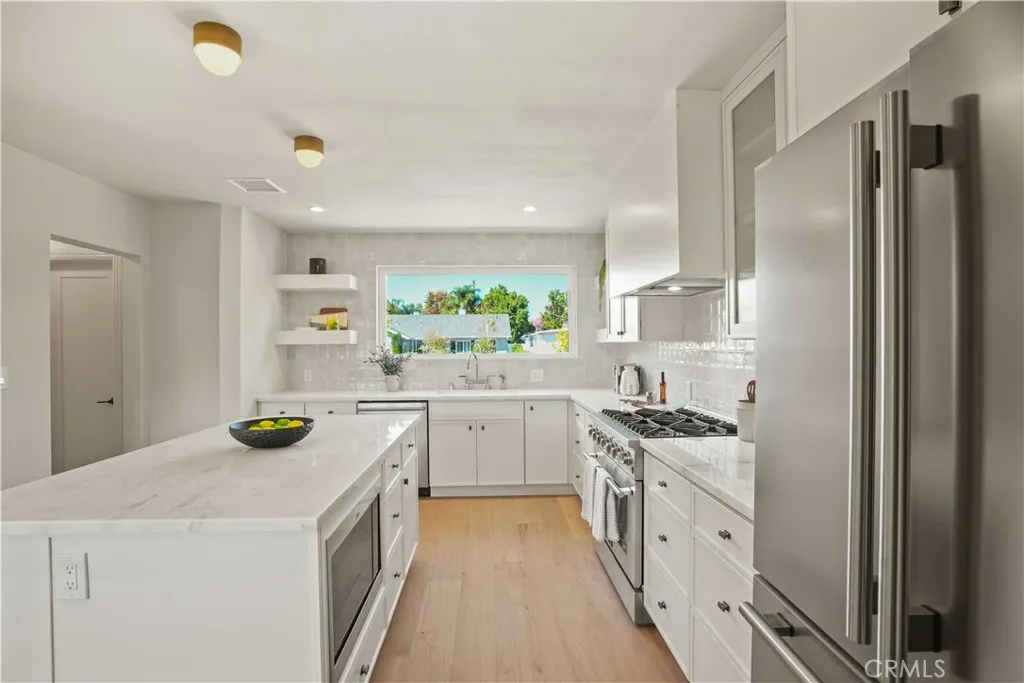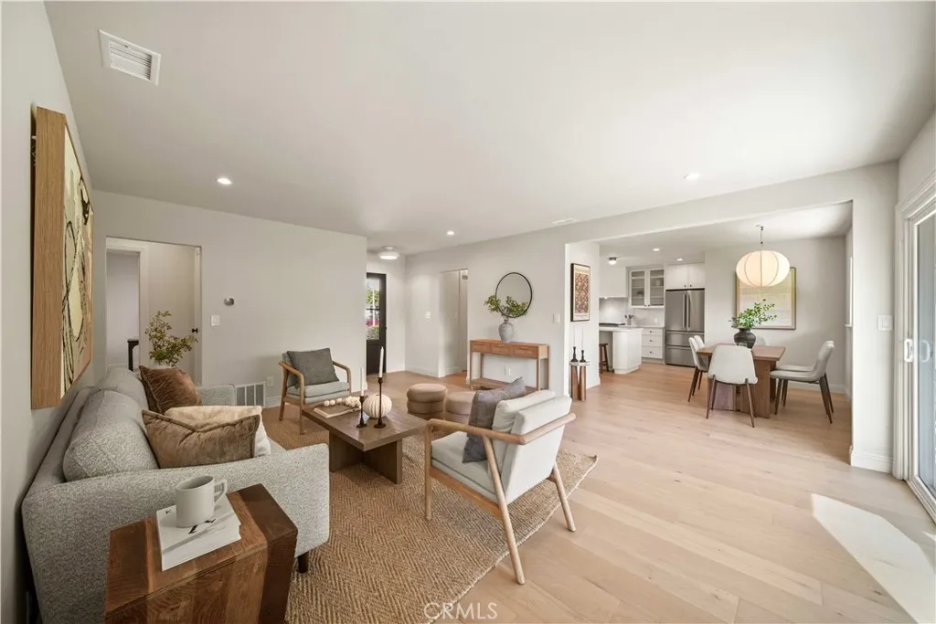 Welcome to this beautiful single-story showplace, nestled in the desirable "Encino Village" neighborhood. This thoughtfully reimagined, light-filled home showcases gorgeous hardwood floors that flow seamlessly throughout. The inviting living rm boasts an open floor plan with high ceilings, recessed lights & a large formal dining room bursting with natural light. The stunning chef's kitchen comes equipped with beautiful custom (soft closing) cabinets, gorgeous quartz countertops, designer tile backsplash, professional-grade stainless-steel appliances & large center island. The primary bedroom w/ walk-in closet offers a sanctuary with a spa-like ensuite bathroom that includes a designer vanity, custom tile/fixtures, and a huge walk-in shower. The secondary bedrooms are good size and are adjacent to the remodeled hallway bathroom, which includes stylish tile, new vanity & relaxing soaking tub. Step outside and enjoy the lush grounds within your private backyard, including... stamped concrete decking, mature foliage & rolling grass that is great for entertaining all your family and friends. With the upgraded HVAC system, dual paned windows and individual laundry room... this GEM is the one you have been waiting for!