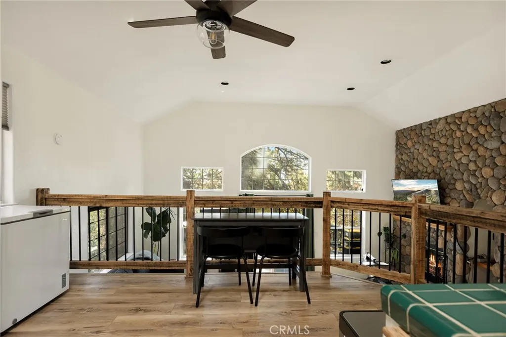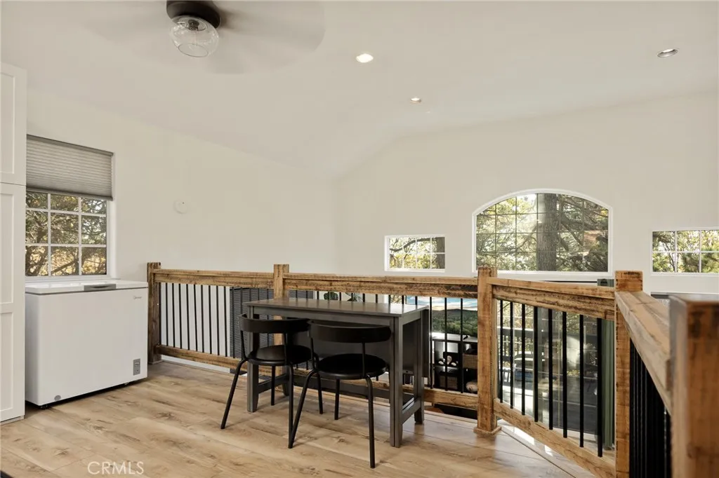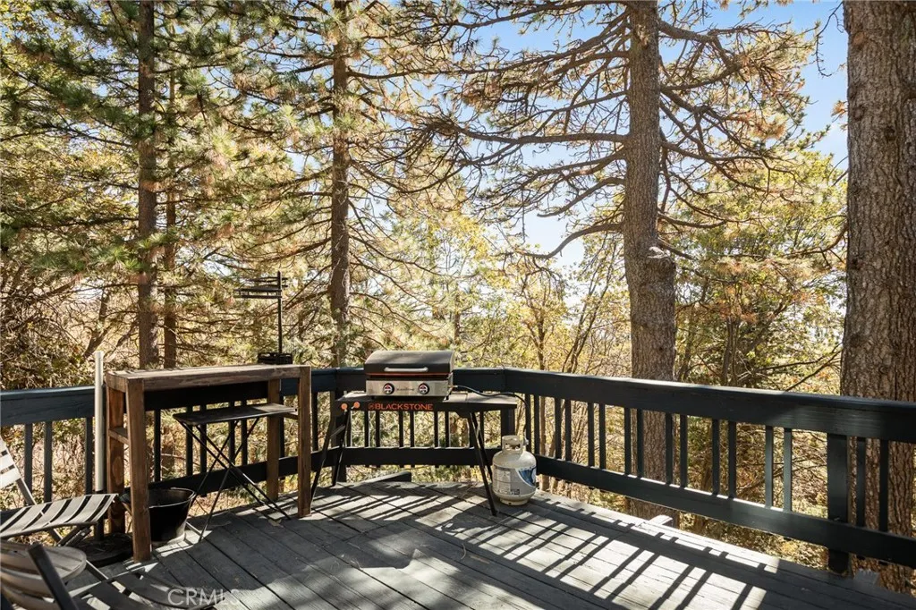 Pride of ownership shines throughout this beautifully maintained 3-bedroom, 2.5-bath Rim Forest home, thoughtfully built by Kenney Anderson. Ideally situated just minutes from Hwy 18, this commuter-friendly property offers the perfect blend of mountain serenity and everyday convenience. Step inside to discover soaring ceilings, fresh interior paint, new wood-style vinyl flooring, and an abundance of natural light. The open-concept layout connects the kitchen and dining area to the spacious living room  perfect for entertaining or unwinding with peaceful treetop views. Wake up to breathtaking morning sunrises through the large back windows or from the expansive rear deck, where you can enjoy your coffee surrounded by nature. Additional highlights include some newer dual-pane windows, Hardybacker siding on the rear, a newer water heater and furnace, and a brand-new roof for added peace of mind. Multiple decks, generous storage, and parking for four complete this move-in ready mountain retreat  a true gem in the heart of Rim Forest.