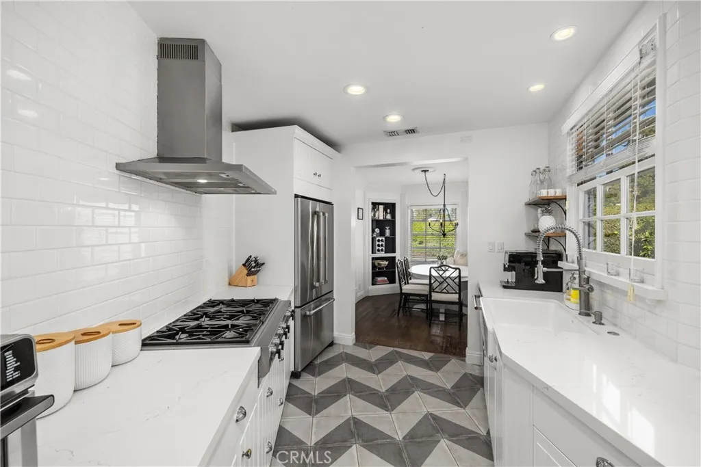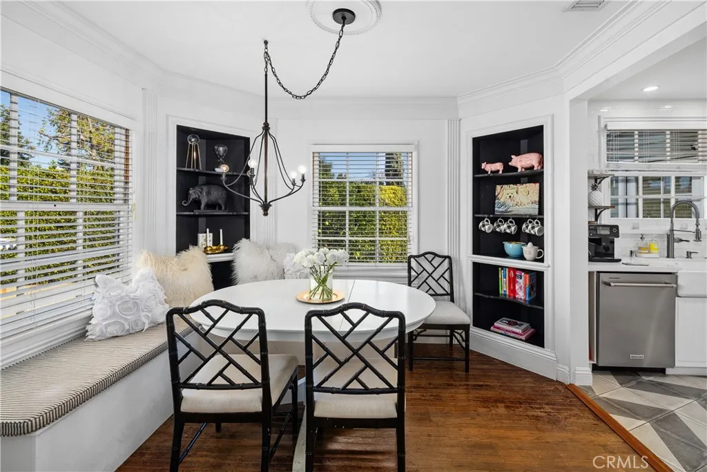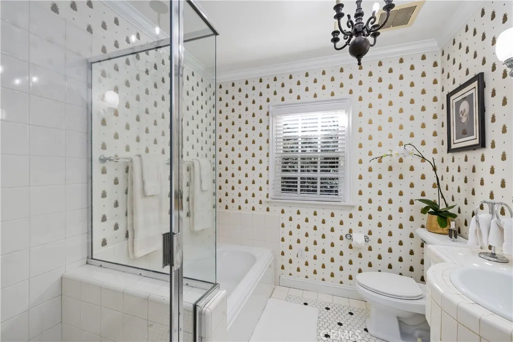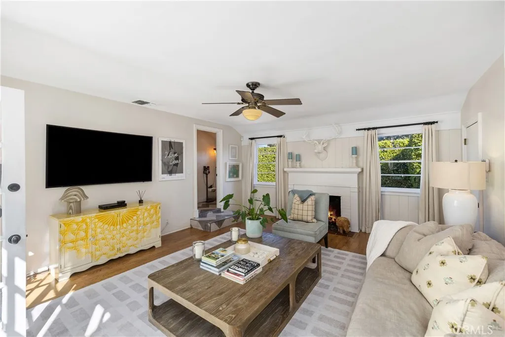 This decorator sharp home sits on an oversized, beautifully landscaped, sweeping corner lot in the heart of the highly desirable Magnolia Woods area of Sherman Oaks! The gorgeous traditional curb appeal is enhanced by a parklike front yard, surrounded by tall hedges added for privacy! The light and bright living room has French bay windows, hardwood floors and a fireplace. The stunning chef's kitchen has top of the line Jenn-Air appliances including a double convection oven, a gas 6 burner range, a farm sink, quartz counters, subway tile backsplash and a butcher block buffet/bar counter! The dining area has crown moldings, built-in seating and corner shelves! The spacious laundry room has quartz counters and a sink. The bonus room has a fireplace and French doors that open to a large stone patio with a fireplace, perfect for dining al fresco. The front bedroom has a large closet and bay window. The hall bathroom has Farrow & Ball wall coverings, a bathtub and tiled shower, floors and counter. The third ensuite bedroom has a fireplace, direct access to the backyard and a renovated bathroom with marble floors and shower. The outside space is magical with outside lighting, multiple seating areas, a fire pit, many citrus trees, a grassy playard and a storage unit. The two car garage has newer garage doors and allows direct access into this wonderful home.