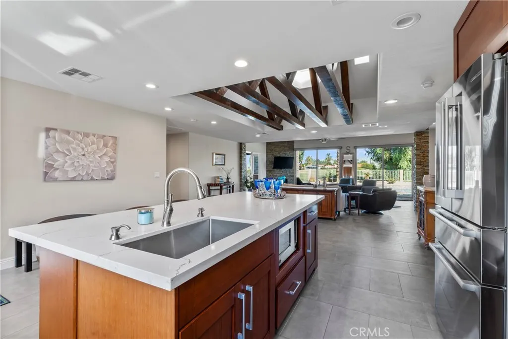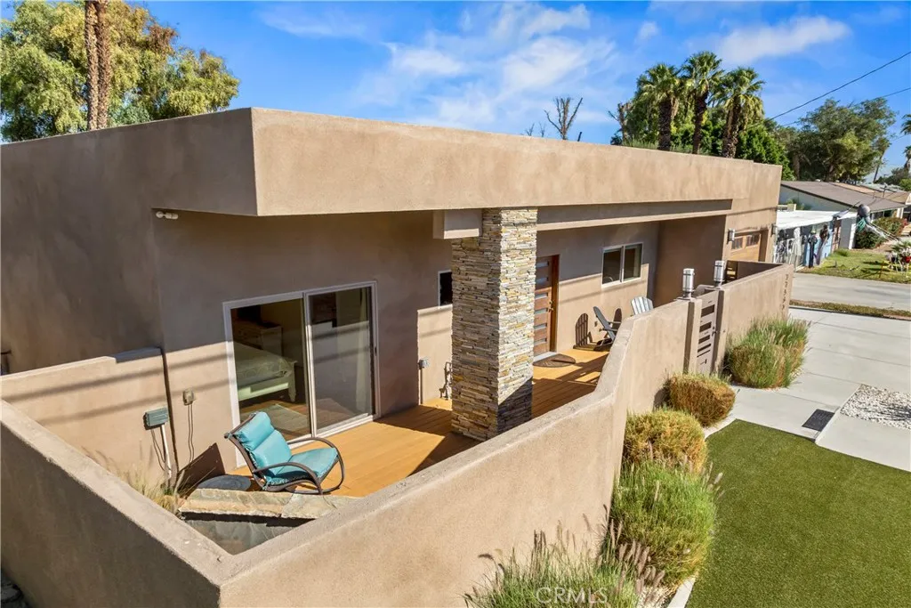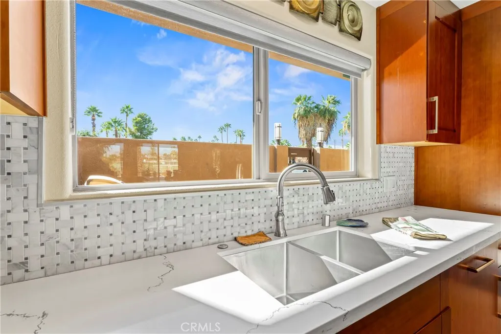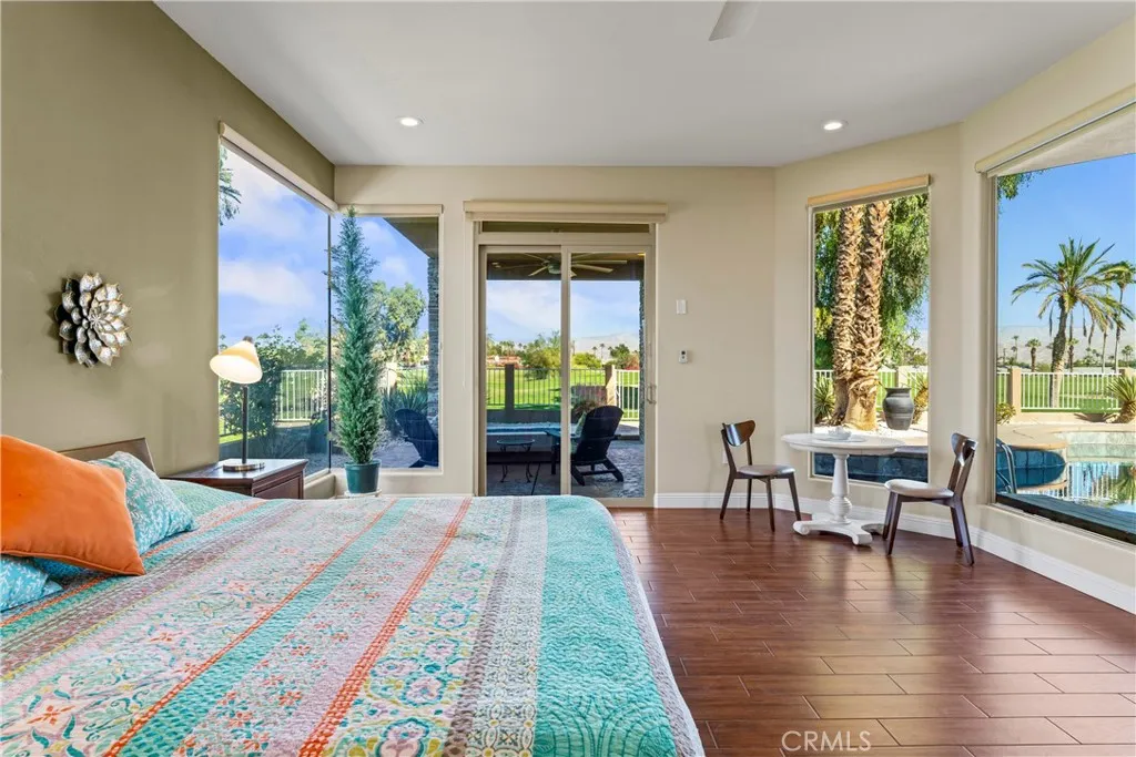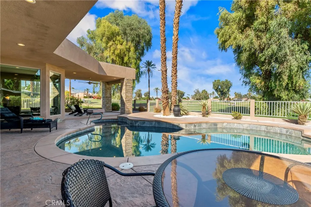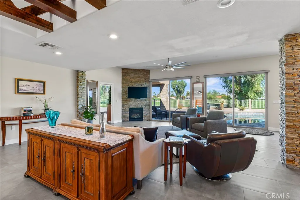 Immaculate turnkey home LOCATED ON THE GOLF COURSE in Palm Desert Country Club. Exquisitely remodeled in 2018 into a highly updated desert modern stucco architectural showpiece with stacked stone accents inside and out. Step into the expansive interior from a walled front deck patio area that ensures privacy from the street. Very flexible floor plan featuring a centrally placed Kitchen & expansive Great Room with large Dining Area and step-down Wet Bar all spaciously open to one another. Living area is filled with light from a very unique, large central open beam & skylight ceiling recess. Incredible 180 degree golf course & mountain views from expansive sliding glass doors & windows opening from the Great Room & Primary Bedroom onto the shaded north-facing showcase rear yard. The pebble tech POOL & SPA surrounded by ample stamped concrete decking, a covered patio with crushed glass fire feature and poolside al fresco dining area create the perfect rear yard haven! Both spacious Bedrooms are en suite with their own private Bath. Entertain guest around the huge island in the chef's Kitchen generously outfitted with ample custom cabinetry, 48" stainless steel dual fuel Thermador range with 6 burners, a grill and 2 ovens, Viking stainless steel interior dishwasher, Viking microwave, Bosch refrigerator/freezer, 2 sinks and stone countertops. Primary Bedroom Suite features a large en suite bath with huge walk-in shower and a couple's soaking tub surrounded by custom tile, dual basins recessed into stone countertops and unique skylight and open beam ceiling. Bedroom Suite 2 opens