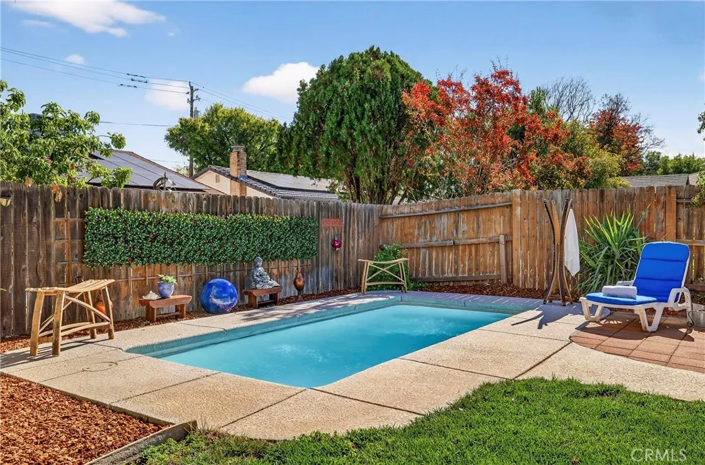 Welcome to La Casa Courta peaceful cul-de-sac with no through traffic, perfect for families seeking both privacy and convenience. This charming 3-bedroom, 2.5-bath home features impressive soaring ceilings, spacious living areas, and an abundance of natural light. The formal living room, with elegant tile flooring and a cozy gas fireplace with mantel, provides an inviting space for both relaxation and entertaining.The home offers two large living spaces, perfect for multiple uses, from family movie nights to more formal gatherings. The functional kitchen, tucked in the corner for added privacy, provides a functional layout with plenty of storage and counter space. A spacious dining area adjoins the kitchen, creating a seamless flow for mealtime and entertaining. A spacious laundry room with ample storage and a convenient half bath complete the main floor. Upstairs, the private primary suite offers dual closets and an en-suite bath. Two additional bedrooms share a well-maintained second bath, offering plenty of space for family or guests. Step outside to the beautifully landscaped backyard with a covered patio and in-ground poolperfect for enjoying all four seasons. Theres also space for your own vegetable or fruit garden, adding a personal touch to this outdoor haven. Located just minutes from Bidwell Park and within walking distance of Pleasant Valley High School, Marigold Elementary, and Bidwell Junior High, this home offers a prime location for families. Plus, its close to shopping, dining, and other amenities for added convenience.Dont miss the opportunity to own this w