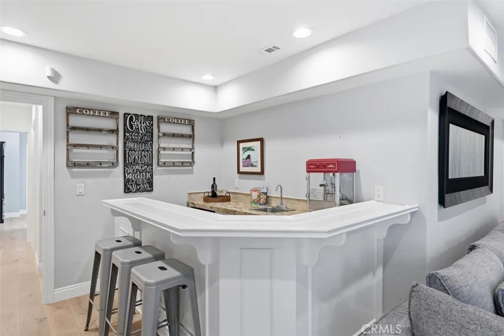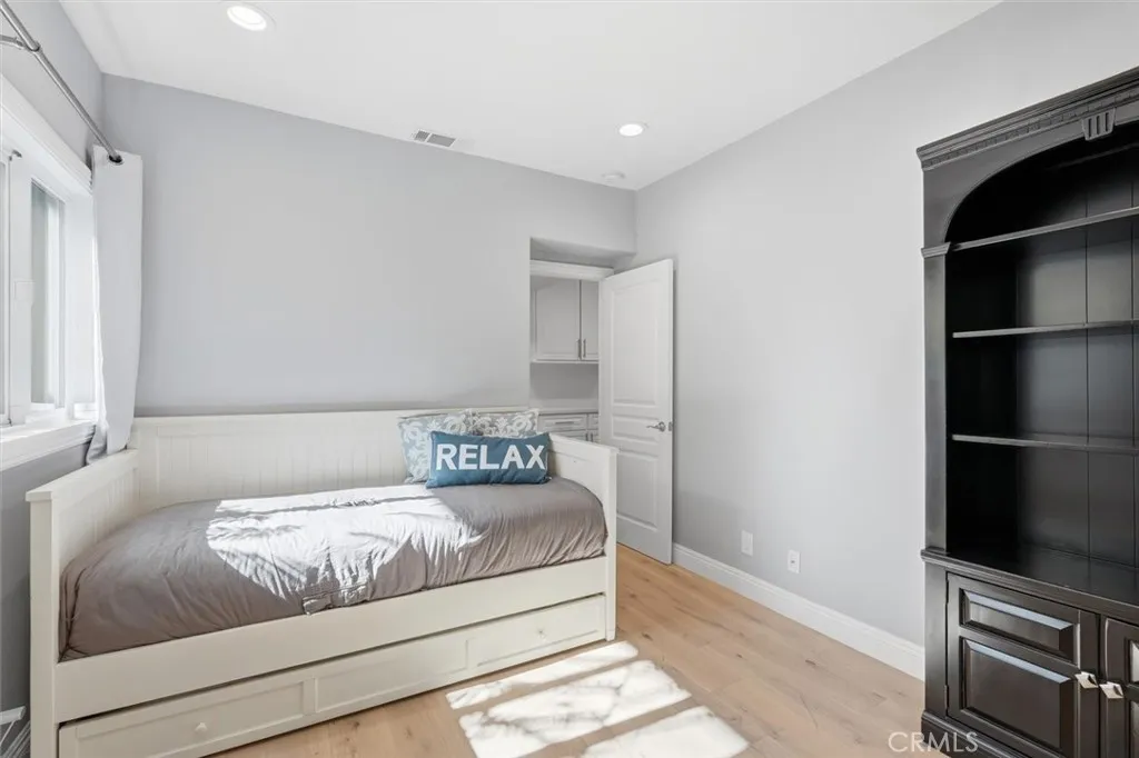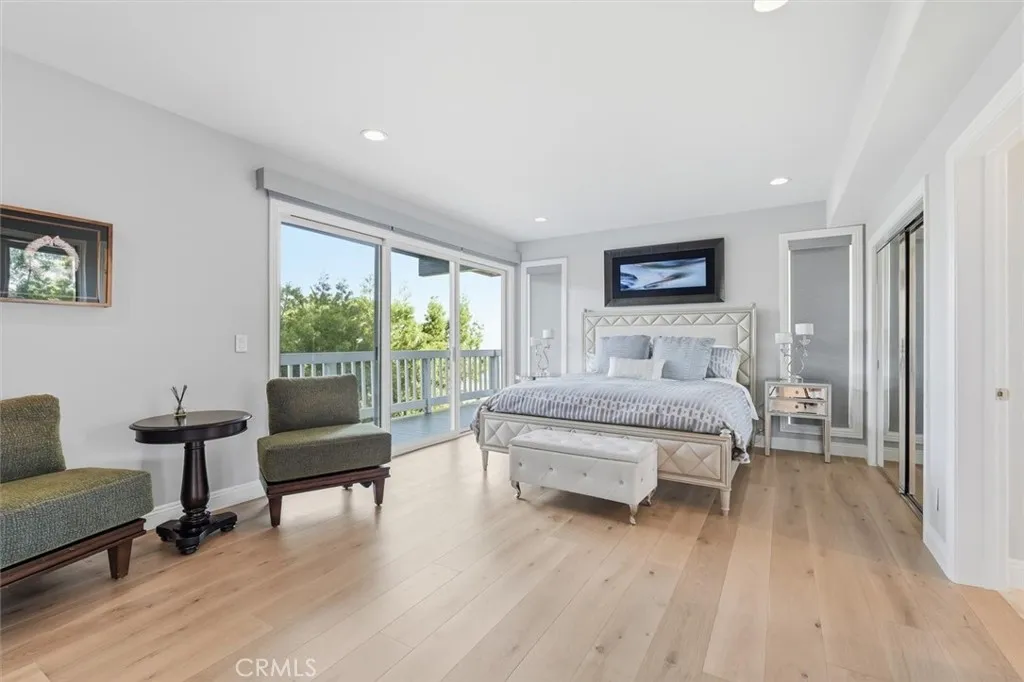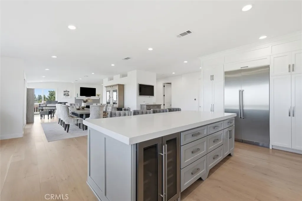 From the moment you walk through the front door, this home unfolds in layersfrom a quiet entryway to a sweeping hillside and city-lights view that catches you completely by surprise. Its the kind of setting that feels worlds away, yet remains close to everything. Surrounded by mature trees and parkland, the property enjoys rare privacy and an open, natural backdropan uncommon luxury for L.A. living. Natural light pours across wide-plank white oak floors, guiding you through an open, connected main level where the living, dining, and kitchen flow effortlessly toward a continuous view deck. Expansive windows frame the hills and shimmering skyline beyond the park, filling the home with a sense of calm and space that only the Palos Verdes hills can offer. The kitchen was designed for those who love to cook, host, and gather. Outfitted with premium Thermador appliances, dual dishwashers, under-cabinet wine refrigeration, and a walk-in pantry with extra pull-out storage, it blends beauty with function. Shaker cabinetry and natural stone counters tie it all together, leading to a living area anchored by a sleek modern fireplacewhere evenings unfold with the distant glow of city lights as your backdrop. Downstairs, all bedrooms are thoughtfully grouped to create a peaceful retreat separate from the main living spacesideal for households that love to entertain. Two primary suites offer flexibility for guests or multi-generational living, while the main suite elevates the experience with dual mirrored closets, a walk-in, motorized blackout shades, and a spa-style bath with soaking tu