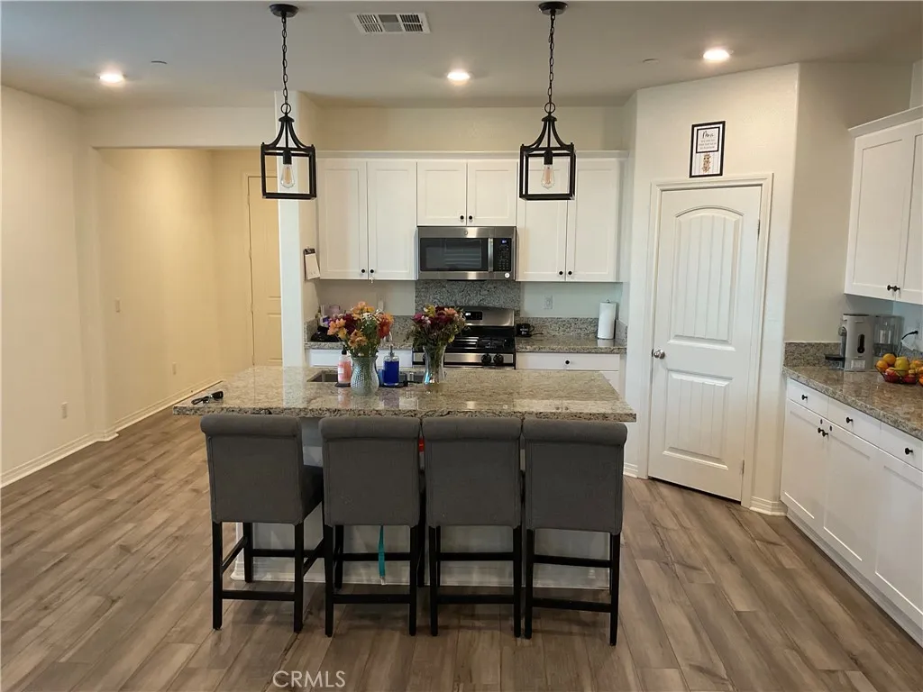 Welcome to this beautiful single-story home located in the desirable Shadow Rock Community in the city of Jurupa Valley. This open-concept floor plan features 3 spacious bedrooms and 2 bathrooms. The modern kitchen boasts elegant granite countertops and opens seamlessly to the living and dining areas, ideal for entertaining. Laminate flooring runs throughout the main living spaces, with carpet in the bedrooms for added comfort. The primary suite offers a private retreat with a dual-sink vanity with quartz countertops, and a large walk-in closet. It include dual-pane windows, custom shutters, and paid-off solar panels, providing energy efficiency and savings. Direct garage entry. Recessed lighting, central HVAC, tankless water heater, and a 2-car garage. This home offers both modern living and long-term savings. Enjoy community parks, sidewalks, and nearby amenities in a growing neighborhood. Move-in ready and no HOA.