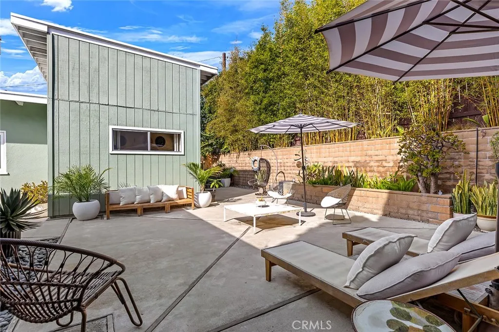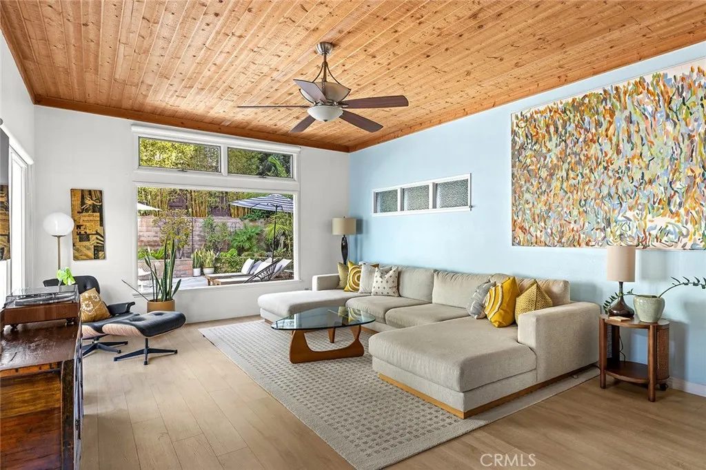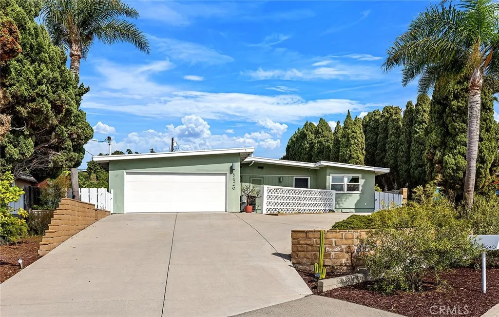 Reminiscent of the iconic architecture in Palm Springs & the Eichlers, this mid-century-modern home awaits in the heart of southern OC's best-kept-secret pocket known as Capo Beach within Dana Point. Upon arrival via the one-way camino, the single level sits elevated off the street up a large driveway with comfortable parking for five cars, plus a two-car garage. Upon entering, several generous living spaces draw you within. Large clerestory windows, high ceiling plates finished in Knotty Pine planks, newer vinyl wood floors throughout most of the home, two updated bathrooms, and an updated galley kitchen make it clear that since its construction in the early 1960s, the property has been maintained and updated in period-correct fashion. The kitchen features stainless appliances and newer improvements including plumbing, cabinetry, and fixtures. Off the kitchen, light-filled informal dining with fitting George Nelson saucer light fixture and two major living spaces - the living room (optional formal dining) with gas fireplace and the family room with high ceilings and large-scale picture windows frame the outdoor spaces beyond. Notable values include newer vinyl windows, French doors, re-roofed (less than 10 years ago), some new plumbing, custom window treatments, new heater & A/C condenser, new water softener, added RO drinking water system, newer tankless water heater, and added saltwater jacuzzi. Recent removal of the rear pergola opened up the patio and mature golden rod bamboo was added at the rear for major privacy. Olive trees were planted at the front to enhance curb