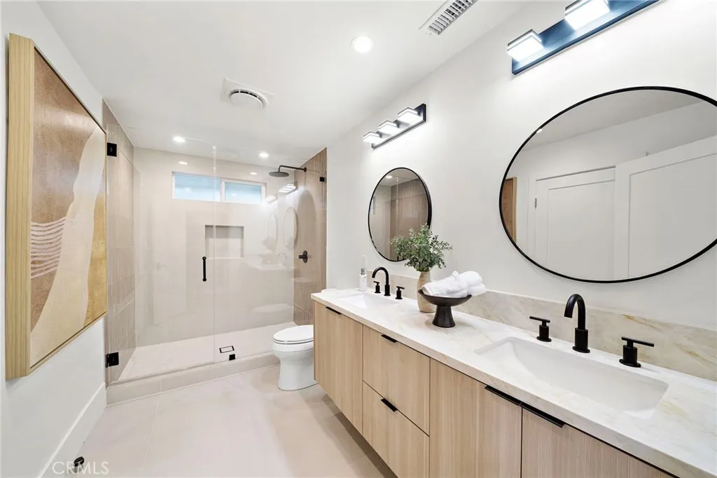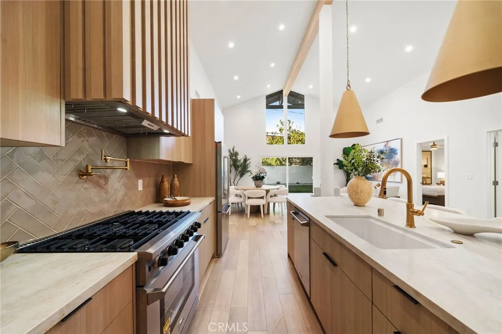 Fabulous Sol Vista single story home. Contemporary, fully remodeled and highly upgraded throughout! This home was taken down to the studs and has all new PEX plumbing in walls, all new electrical wiring, new electrical panel, new ducting, new water heater, new furnace system, new underground plumbing and drain lines. All work was done to code and permitted by the City of HB. Spacious open concept floor plan with high volume ceilings let in tons of natural sunlight. High end designer finishes throughout! Spectacular kitchen with massive center island, custom flat panel European cabinetry and sleek Taj Mahal Quartz counters. High end THOR appliances and beautiful designer selected tile backsplash. The family room is open to the kitchen and the ample dining area is designed to accommodate all your gatherings and effortless entertaining. The formal living room has high beamed ceilings and a inviting fireplace with custom tile accents. Rich white oak LVF flooring flows seamlessly throughout the home. The primary suite is spacious in design and has a walk-in closet. The spa inspired primary bath has gorgeous floating cabinetry, quartz counters and a ample sized walk-in shower and deep soaking tub. Three other bedrooms two of which offer en suite baths with crisp contemporary design. The backyard has a nice patio area, mature landscaping with lush lawns, fruit trees and tons of sunshine for your enjoyment! Come to Huntington Beach and enjoy the best of Coastal California living!