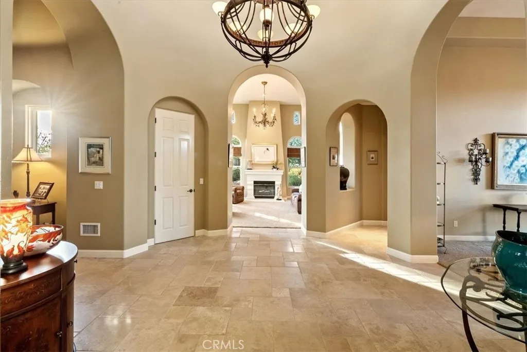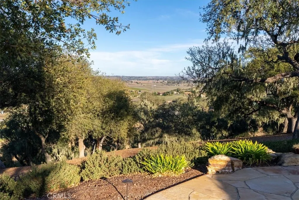 Experience refined Central Coast living in this stunning 4,146 sq. ft. Spanish Colonial estate, perfectly positioned on a private 3 acre parcel within the exclusive gates of Santa Ysabel Ranch. Enjoy sweeping 180 views of vineyards and mountains from nearly every room. This 4-bedroom, 3.5-bath home welcomes you through a grand rotunda entry with soaring ceilings, custom lighting, and travertine flooring throughout. The formal living and dining rooms feature tall Anderson windows framing breathtaking vistas and a cozy gas fireplace. The gourmet kitchen is equipped with GE Monogram stainless appliances, including a six-burner range, double ovens, wine fridge, and granite countertops with maple cabinetry. The adjoining family room and casual dining area create an inviting space for entertaining with seamless indoor-outdoor flow. The spacious primary suite offers privacy, dual walk-in closets, and a luxurious bath with soaking tub and large shower. Additional bedrooms and a flexible office space capture beautiful hillside and sunset views. Outdoor living shines with expansive flagstone patios, multiple sitting areas, and lush landscaping surrounded by heritage oaks - perfect for dining, relaxing, or entertaining under the stars. Additional features include an epoxy-finished 3-car garage with custom cabinetry, Culligan water system, ADT security, and custom lighting throughout. Santa Ysabel Ranch offers 24/7 gated security, walking trails, tennis courts, and a serene lake setting - an unparalleled blend of luxury, privacy, and natural beauty.