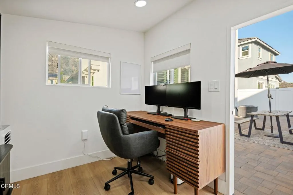 Welcome to Eastbridge at Heritage Grove! This beautifully upgraded home offers a bright open-concept layout with a kitchen that flows into the living and dining areas perfect for gatherings or everyday life. The kitchen features quartz counters, subway tile backsplash, a pantry, and a spacious island. Step outside to a private, low-maintenance yard with gorgeous pavers and detached office shed complete with electrical ideal for working from home or creative projects. Upstairs, you'll find the stunning primary suite with its own balcony overlooking the Fillmore Mountains, a walk-in closet, and a spa-like ensuite with a soaking tub and separate shower. Three additional bedrooms, a full hall bath, and a convenient laundry room complete the second level. Upgrades include luxury vinyl plank flooring throughout, new window coverings and plantation shutters, modern fixtures and lighting, a whole-house water filtration system, and owned solar for energy efficiency. Enjoy access to the community's resort-style amenities including a pool, 27-acre nature park, playground, and picnic areas -- plus easy access to local trails and outdoor recreation.