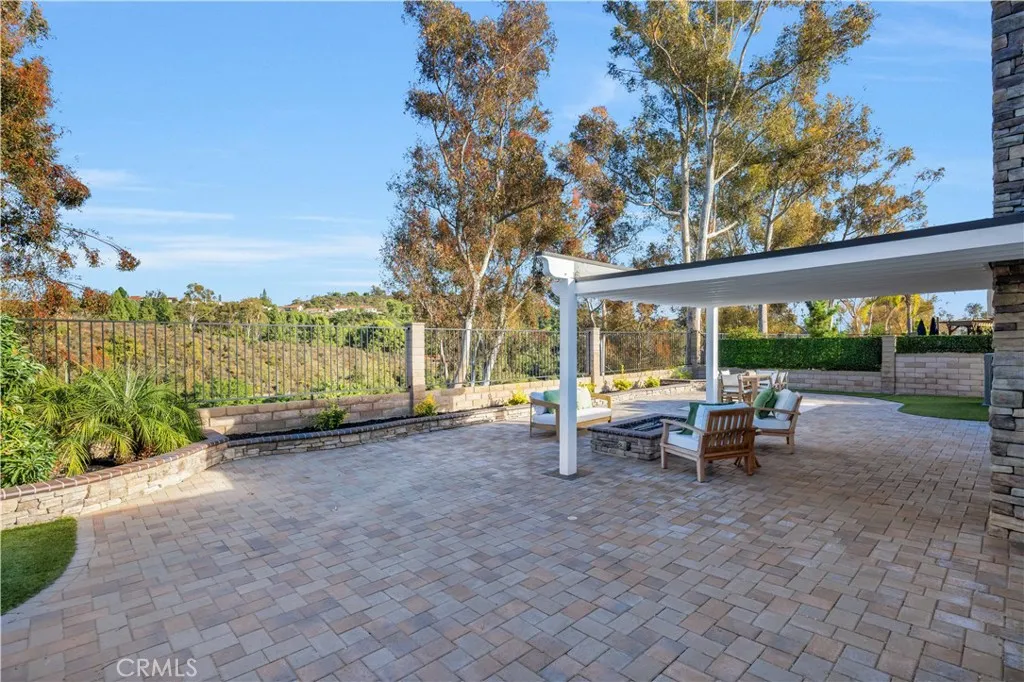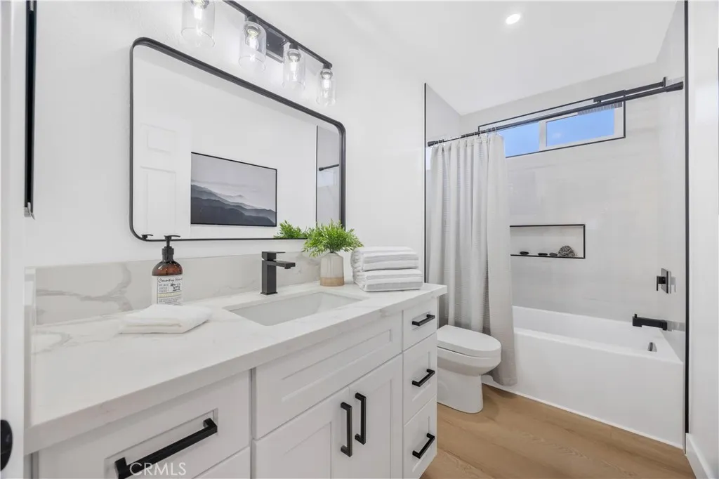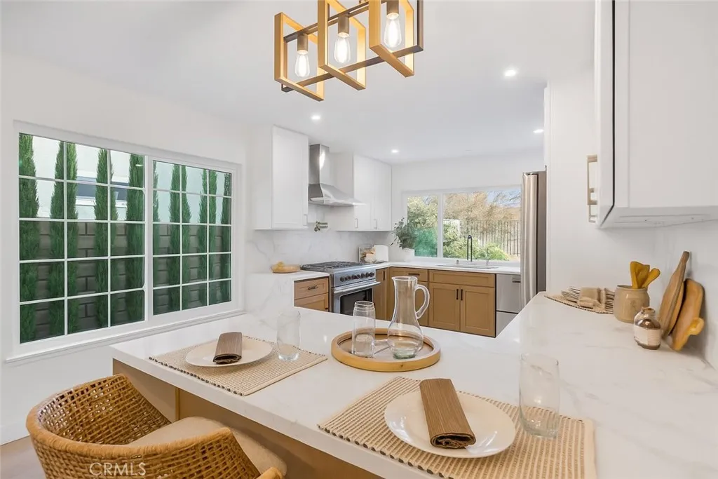 This beautifully renovated single story home sits on a quiet cul de sac in Mission Viejo and perfectly blends modern upgrades with style and functionality. Every detail has been thoughtfully designed, from energy efficient systems to designer finishes, making it a truly move in ready residence. Inside, high end waterproof hybrid laminate flooring flows seamlessly throughout, accented by modern baseboards, fresh paint, updated outlets, switches, hardware, and energy efficient LED recessed lighting. The fully remodeled gourmet kitchen showcases custom white and oak Shaker cabinetry with soft close drawers, quartz countertops with a full height backsplash and waterfall edges, ceiling height cabinets, touchless sink with pot filler, and professional grade appliances including a 36" 6 burner Thor gas range, Thor drawer microwave, Thor wine fridge, GE Profile double drawer dishwasher, Samsung refrigerator, and sleek range hood. An elegant farmhouse chandelier and updated fireplace bring warmth to the family room, while new hallway cabinetry and a high capacity washer dryer with overhead storage add convenience. The primary suite offers a spa like retreat with a walk in shower featuring oversized shampoo niches, double vanities with quartz counters, soft close cabinetry, and upgraded fixtures. All bathrooms have been fully remodeled with modern cabinets, countertops, faucets, mirrors, and low flow toilets. Each bedroom has new flooring, baseboards, paint, and lighting for a fresh, modern feel. Additional smart home features include a Nest thermostat, Ring camera doorbell, and a fu