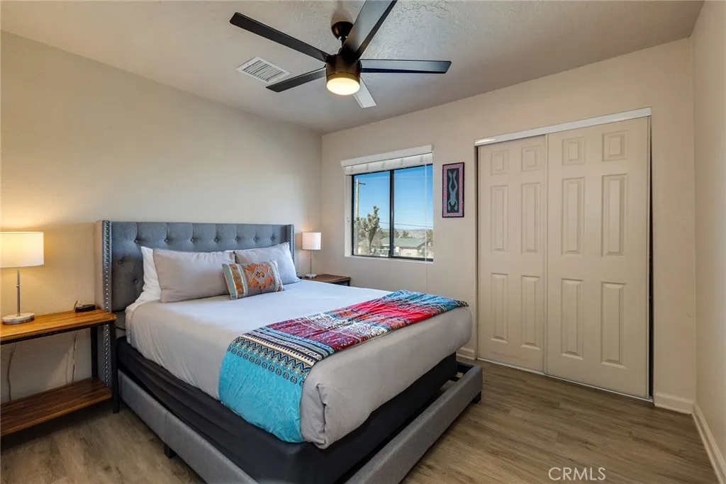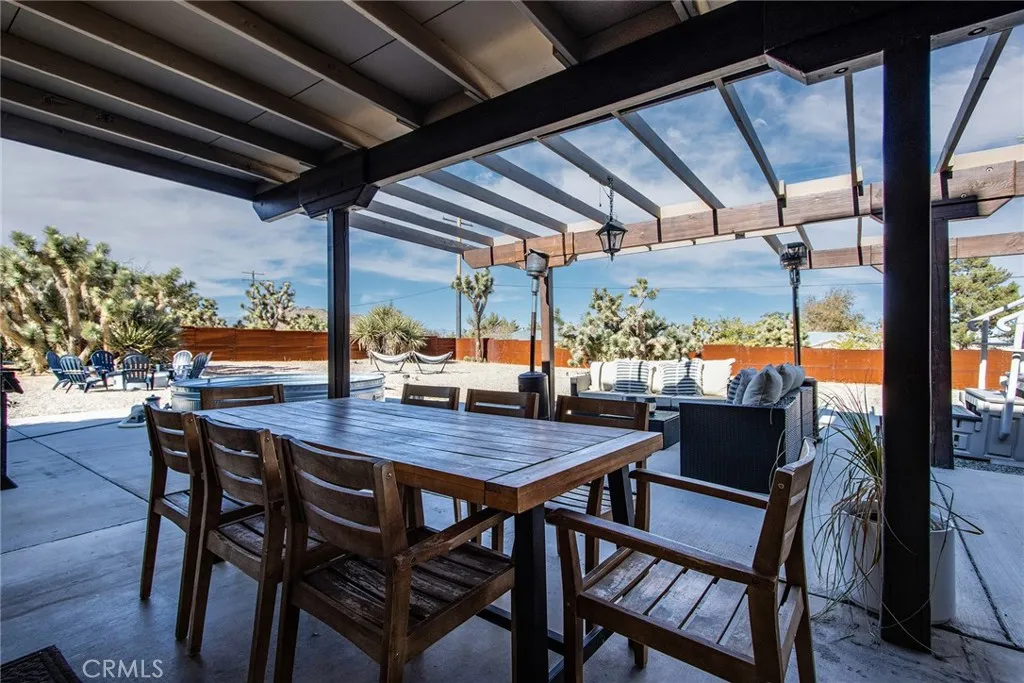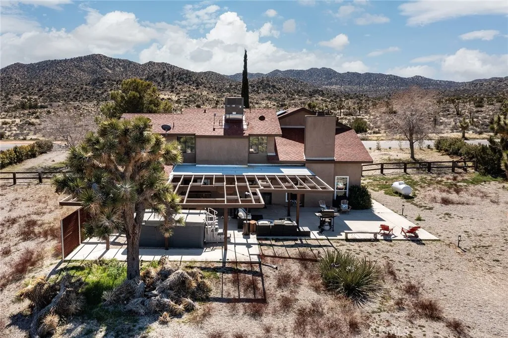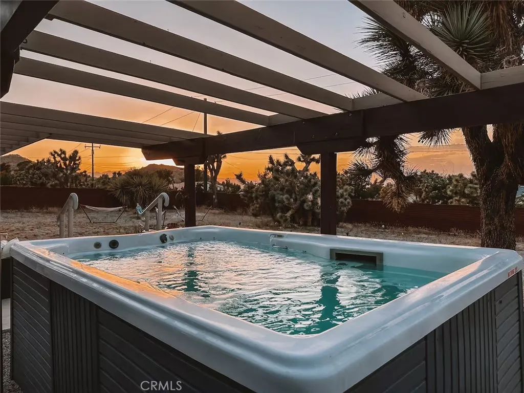Welcome to The Lodge at Blackrock, a striking modern lodge-style residence designed by a renowned global interior designer. Located in the sought after Upper Sky Harbor on the last paved street at the top of the hill, this property is mere steps away from Joshua Tree National Park and hiking at Blackrock entrance, offering a rare blend of luxury, comfort, and iconic desert serenity. Step inside to a grand two-story living room anchored by a massive stone wood-burning fireplace, with walls of glass framing panoramic desert and mountain views. The open floor plan flows into a formal dining area and a chefs kitchen with premium finishes, ample counter space, and a cozy breakfast nook. A second living area with a pellet stove fireplace provides a warm and inviting retreat. The home features 5 bedrooms (tax roll shows 4 beds - additional bed in converted dining room) and two-and-a-half baths, including a spacious primary suite with a luxury soaking tub and walk-in shower. Outdoors, relax in the 10-person swim spa, cool off in the cowboy tub, or gather around the fire pit under starlit desert skies. Located in a quiet neighborhood known for its natural beauty and peace, The Lodge at Blackrock offers a truly immersive desert lifestyle. Whether as a primary residence, vacation retreat, or investment property, this home checks all the boxes!