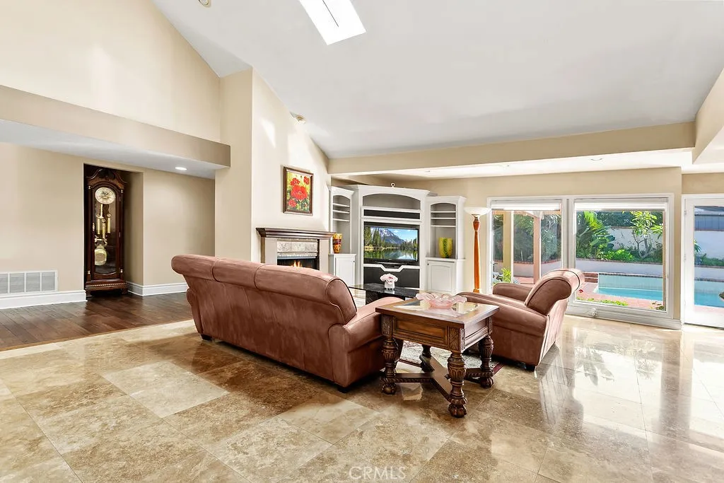 This serene and tranquil Villa Park lux estate enjoys one of the most unique and exclusive locations available on the market today. Tucked away in Villa Parks rolling hills, this expansive 5362 square foot gem boasts a true cul-de-sac location, complete with gated entry. The mix of mid-century modern style and extremely private location gives this estate a feeling reminiscent of the historic Hollywood Hills. Enter through the automated privacy gate into lush grounds with mature landscape, drought tolerant turf and ample on-site parking. Glass inlaid double doors give way to a spacious and inviting entry. Travertine floors, floor to ceiling windows, and crisp architectural lines set the tone for this elegantly finished estate. The living room boasts soaring ceilings, corner fireplace, custom base, and clear pane elevated windows for lots of natural light. The dining room is spacious and expertly located between the kitchen and formal living room. With plenty of room for a 10-person dining set, this dining room is perfect for quiet family nights or those busy holiday events. The kitchen is for the culinary enthusiast, complete with high end Thermador appliances, Sub Zero Fridge, double ovens, 6 burner gas range w/ hood, granite counters, stain grade custom cabinets, and an open ceiling concept. The family room is open and kitchen adjacent giving a great room concept feel and lends itself perfectly to family gatherings and entertainment. The primary bedroom feels open and awash with light due to the cathedral ceilings and corner window set complete with views of the beautiful