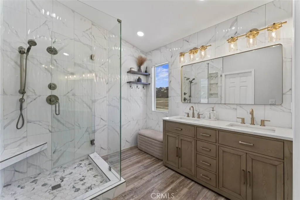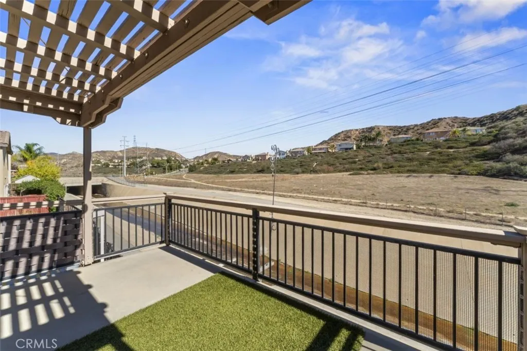 Stunningly upgraded and recently remodeled home with no rear neighbor. Must be seen to be believed! This beautiful residence showcases modern luxury and thoughtful upgrades throughout. The remodeled kitchen features quartz countertops, a full-wall backsplash, stainless steel appliances, a large center island with seating, and custom cabinetry. The inviting family room includes a custom-built media wall with shelving and a ceiling fan, perfect for relaxing or entertaining. Large living room & Dining area with a custom chandelier. Enjoy durable and stylish luxury vinyl flooring throughout the downstairs, stairs, and upper hallway, along with elegant custom plantation shutters downstairs. Upstairs, a spacious loft with a ceiling fan offers added living space and flexibility. The primary suite impresses with vaulted ceilings, a private balcony with serene hillside views, and a ceiling fan. The updated primary bath features a frameless shower, dual sinks, quartz counters, ceramic dymo calacatta wavy white 12x24, plus luxury vinyl flooring. Additional highlights include a paid-off solar system, upgraded Rheem variable-speed furnace and evaporator coil, Nest Generation 3 thermostat, high baseboards, and a new water main . The backyard offers a covered patio with a sitting area and privacy, plus exterior security cameras for peace of mind. This home combines comfort, style, and efficiency all in a prime location. Dont miss your chance to see it!