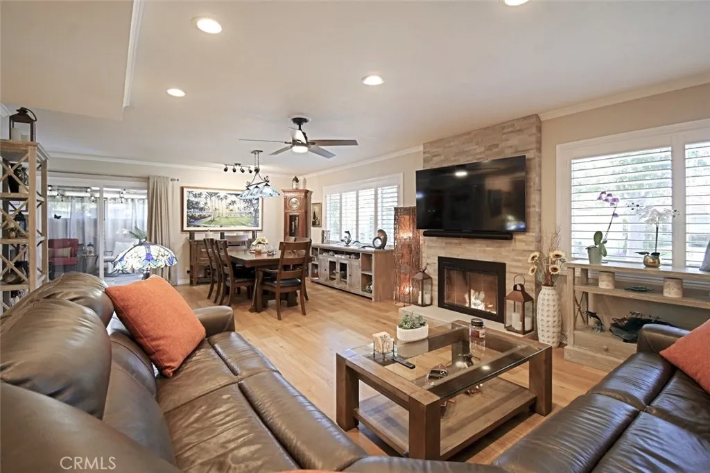 If you are looking for an upgraded and turnkey, move-in ready, single-story home, this is it! Located in a quiet location in the highly desirable age 55+ community of San Juan Hills West adjacent to San Juan Hills Golf Course. Pride of ownership shows throughout this spacious 3 bedroom, 2 bath end unit with upgrades galore! Features included a stacked stone fireplace, plantation shutters, crown molding, luxury laminate wood flooring, recessed lighting, accent track lighting, ceiling fans, air conditioning, and solar tube skylights. The remodeled kitchen boasts custom cabinets, a pantry, stunning granite counters, a large stainless-steel sink, a breakfast bar with pendant lights, and stainless-steel appliances. You'll enjoy relaxing and entertaining in the large covered and tiled patio that offers 2 skylights, built-in cabinetry, a convenient laundry closet with washer and dryer hook-ups and additional storage. The primary suite features both a walk-in closet and a mirrored wardrobe closet, an updated bathroom with a large custom tiled shower, a dual sink vanity with a quartz countertop, and a private patio with a spa! The 2nd bedroom offers a pull-down ladder for access to attic storage, and the 3rd bedroom has a sliding door to a patio overlooking a tranquil greenbelt. The remodeled guest bathroom features a custom tiled shower with 2 showerheads, and an upgraded vanity. This home has been meticulously updated with windows, fixtures, dimmers, energy efficient LED lighting, tankless water heater, re-piped with PEX, and the electrical panel and breakers have been replaced. T