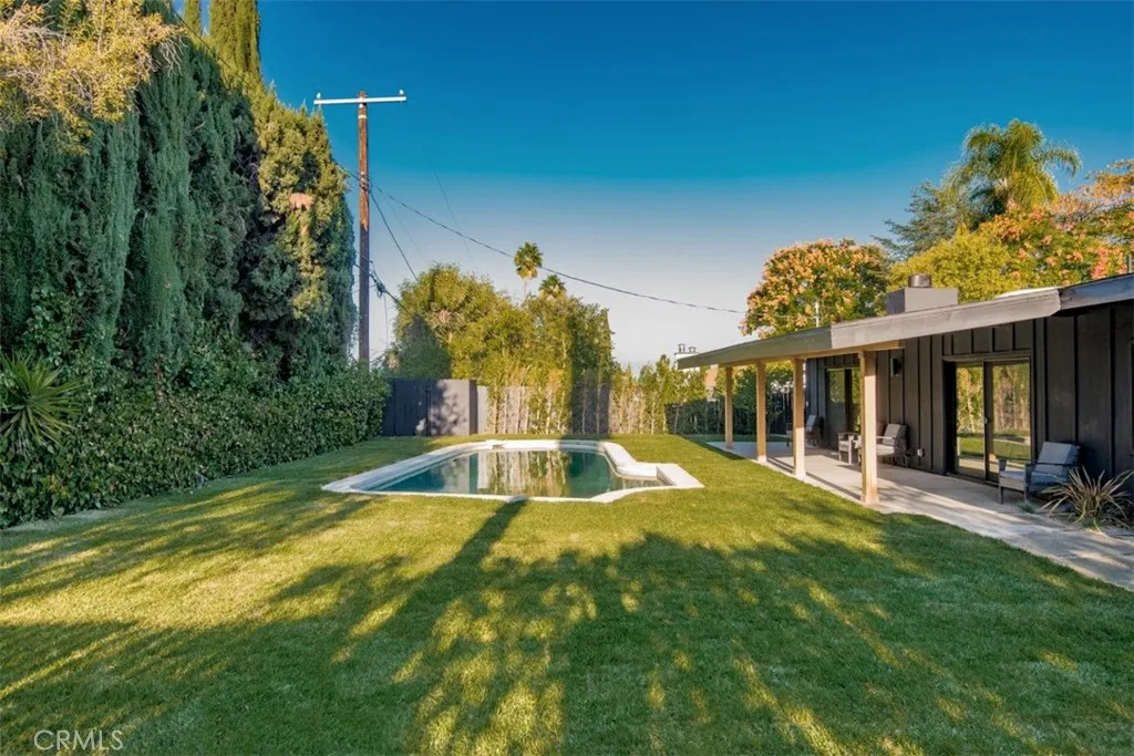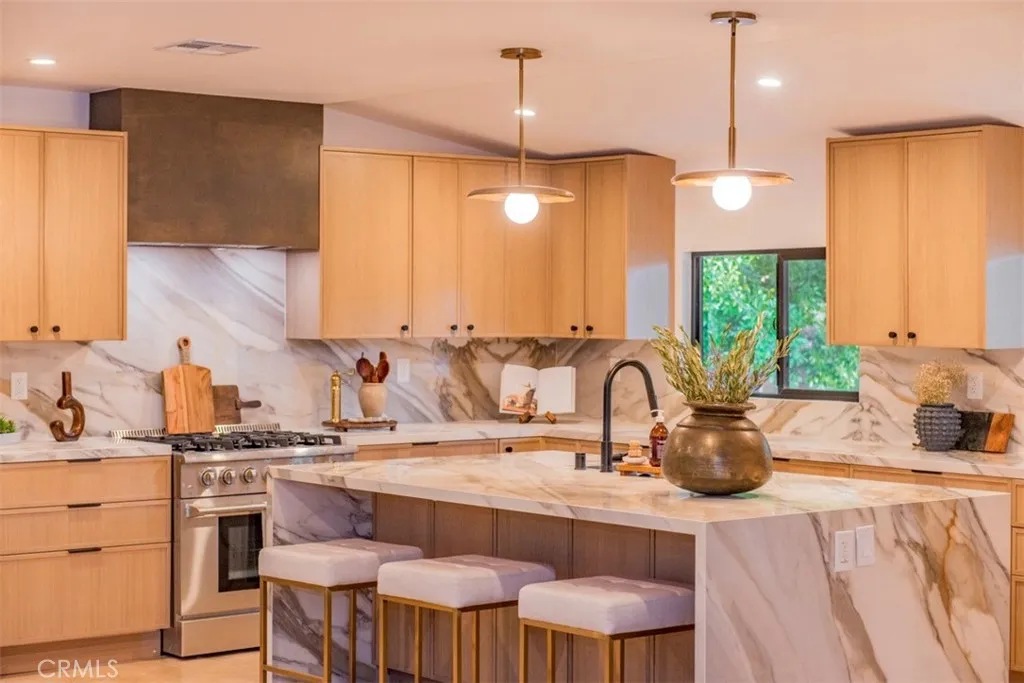 Step into timeless style and modern luxury with this beautifully renovated mid-century home nestled in the heart of one of Woodland Hills most desirable neighborhoods. This stunning 4-bedroom, 3-bathroom residence perfectly blends classic architectural charm with contemporary finishes and thoughtful design. An open-concept floor plan showcases expansive living spaces with real white oak shiplap ceilings, clean lines, and abundant natural light pouring through the home. The chefs kitchen features sleek custom oak cabinetry, Macchia stone countertops, premium stainless-steel appliances, designer light fixtures and a generous island perfect for entertaining. The primary suite offers a serene retreat with a spa-like ensuite bathroom and access to the private backyard oasis. Twin walk in his & hers closets, a seamless walk in shower, stand-alone tub, Italian porcelain tile, white oak tower cabinetry and Delta fixtures. Each additional bedroom is spacious and bright, while all three bathrooms have been tastefully updated with designer fixtures and finishes. Enjoy seamless indoor-outdoor living with sliding glass doors that open to your private landscaped backyard featuring a newly built BBQ area with refrigerator, grill and seating, a sparkling backyard pool which sits at the heart of the outdoor space, ideal for gatherings or relaxing under the California sun. Every inch of this home has been reimaginedfrom new oak flooring and lighting to updated plumbing, electrical, roof, sewer, AC, furnace, tankless water heater, windows, doors, kitchen, bedroom, bathrooms and energy-efficie