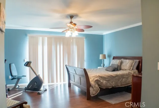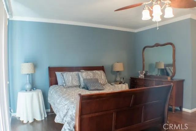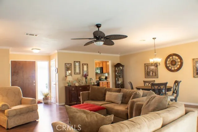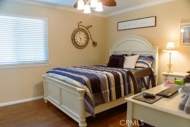 Welcome Home - Desirable pocket community in Indian Hills a peaceful, friendly and quiet area situated in the Jurupa Valley. This residence has been well maintained. A gated courtyard welcomes you, as you enter the home you will find wood flooring and crown moulding throughout. The living room is open and inviting with sliding doors showcasing the greenbelt that sits alongside the covered patio. The kitchen has ample counter and cabinet space, a dishwasher and built in microwave. The primary bedroom generously offers sliding doors, 2 closets and en suite bathroom. Secondary bedroom has a walk in closet, hall bath with full tub and shower, linen cabinets in the hallway and an inside laundry room. The rear patio is stamped concrete, is covered and gated. What are you waiting for?
